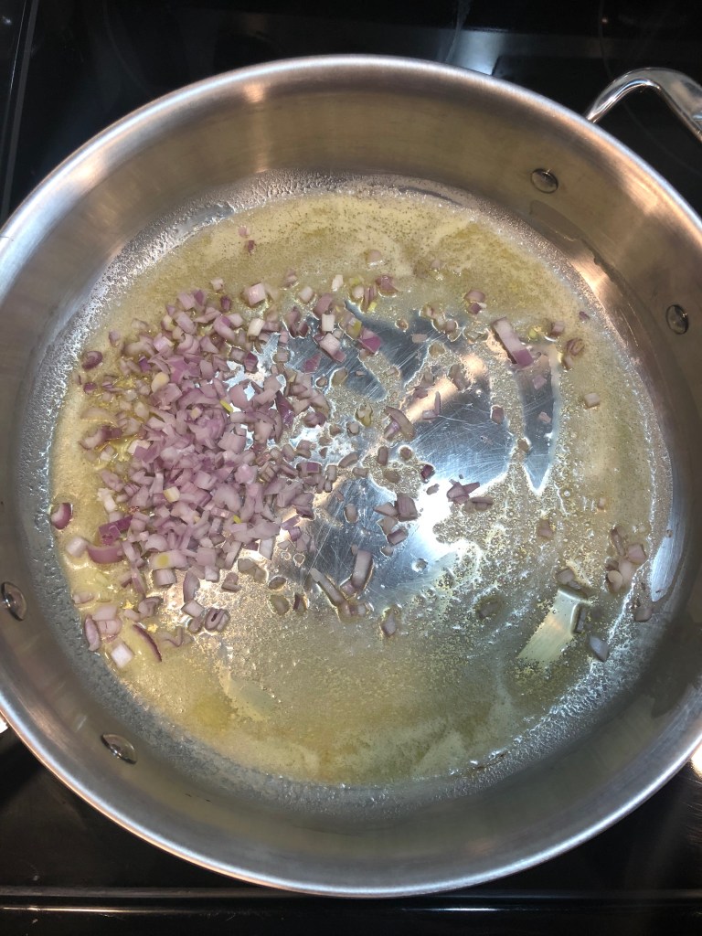 - Once the butter has melted, add in the shallots. Cook for 3-5 minutes until they begin to soften.