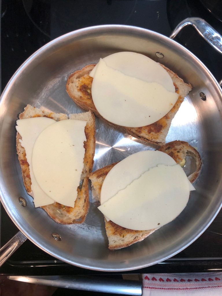 - Place another slice of bread on top of the cheese – pesto face down – you want the butter on the outside, so when you flip it will get a nice golden crust.