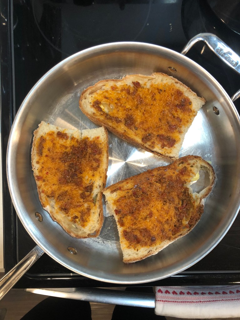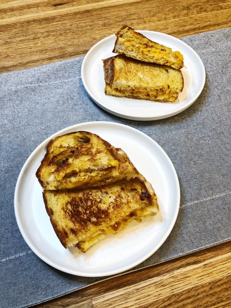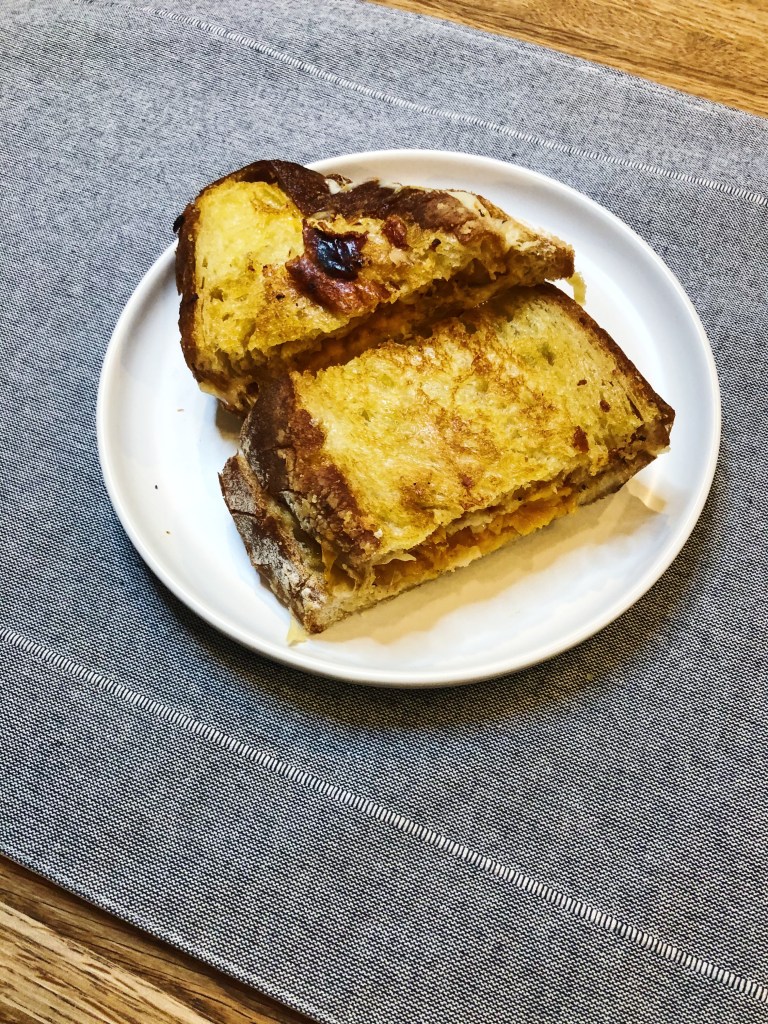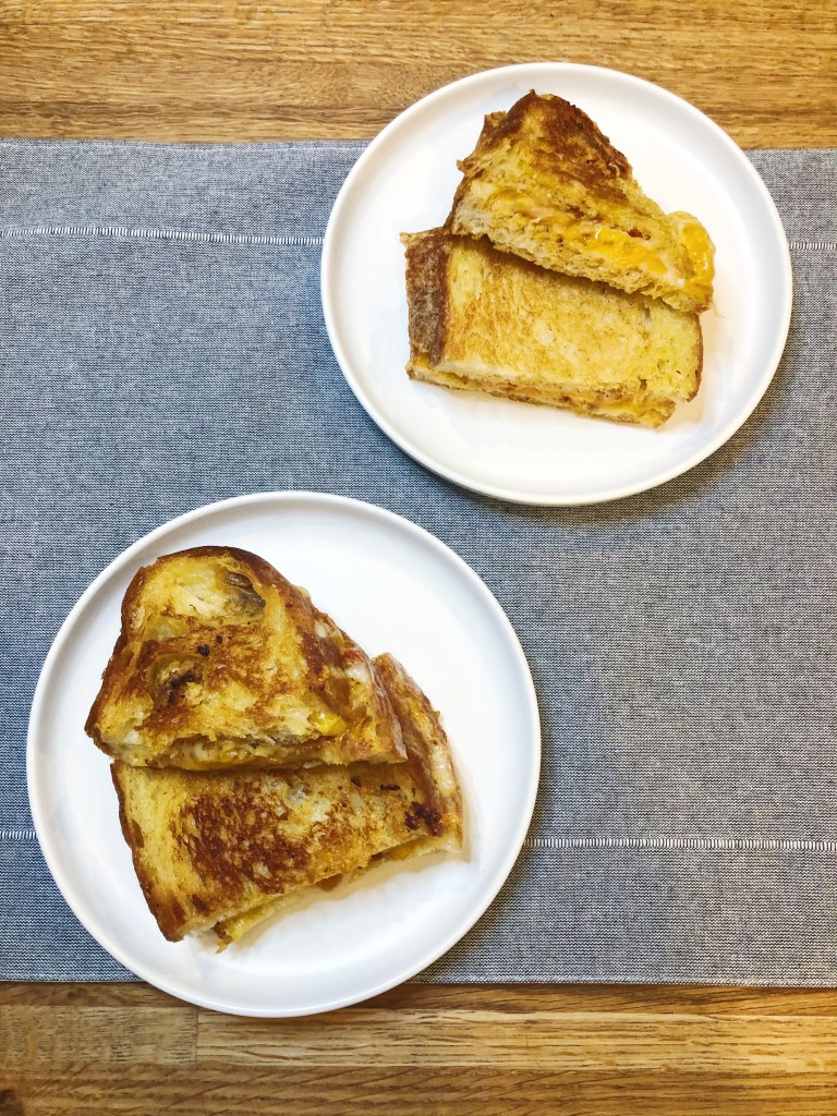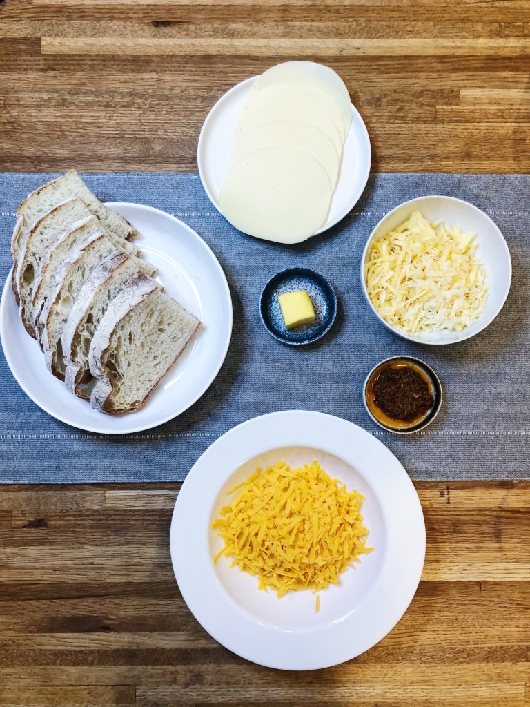 Grilled Cheese is probably one of the most well-known comfort foods around. This grilled cheese was created from the leftovers of a cheese board! I wanted a more ~upscale~ version of a childhood favorite! I remember eating grilled cheese and tomato soup with my mom during snow days and it being the best thing in the entire world. This grilled cheese incorporates a sun-dried tomato pesto so you still get that cheese-tomatoey goodness, just in a different form! Feel free to use whatever leftover cheese you have in the fridge – but I will say, the combination below is very very tasty! Definitely perfect lunch or dinner for a lazy weekend when you want something delicious, but don’t really feel like cooking. This would still dunk great in a tomato soup btw. I will warn you, it is very cheesy, so if you’re lactose intolerant you might want to skip this one! I use 5 cups of shredded cheese plus slices for only 3 sandwiches, but one can never have enough cheese right?