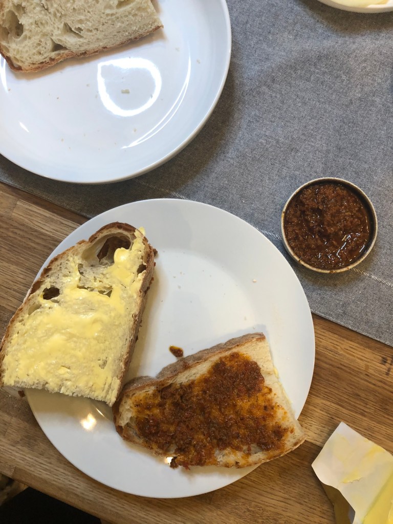 - Spread the tomato pesto on the side of the bread that is not buttered – repeat this until each slice has pesto on it.
