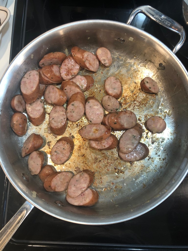 - Drizzle about a tbsp of oil in the pan and add the chicken sausage. Cook until they begin to brown.