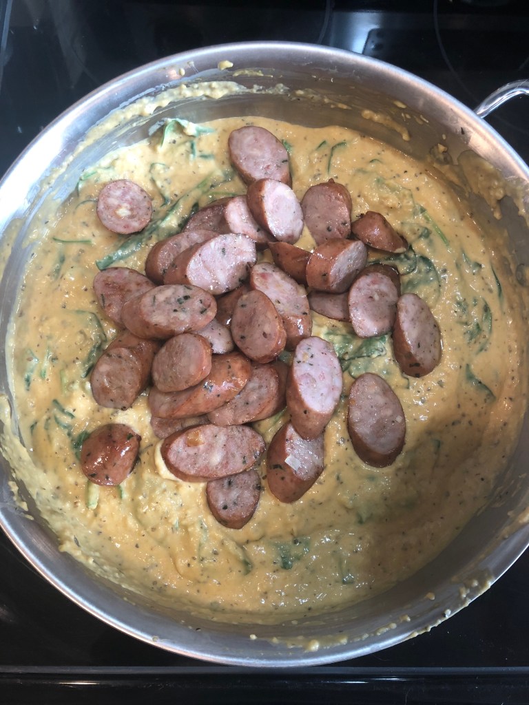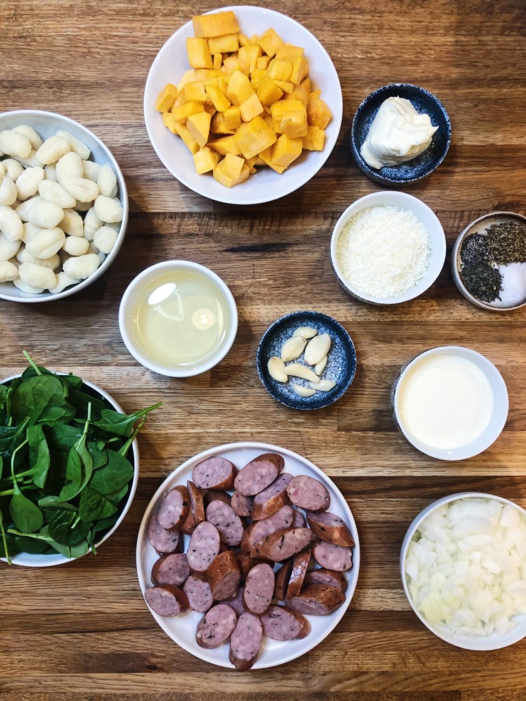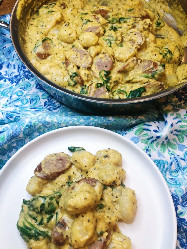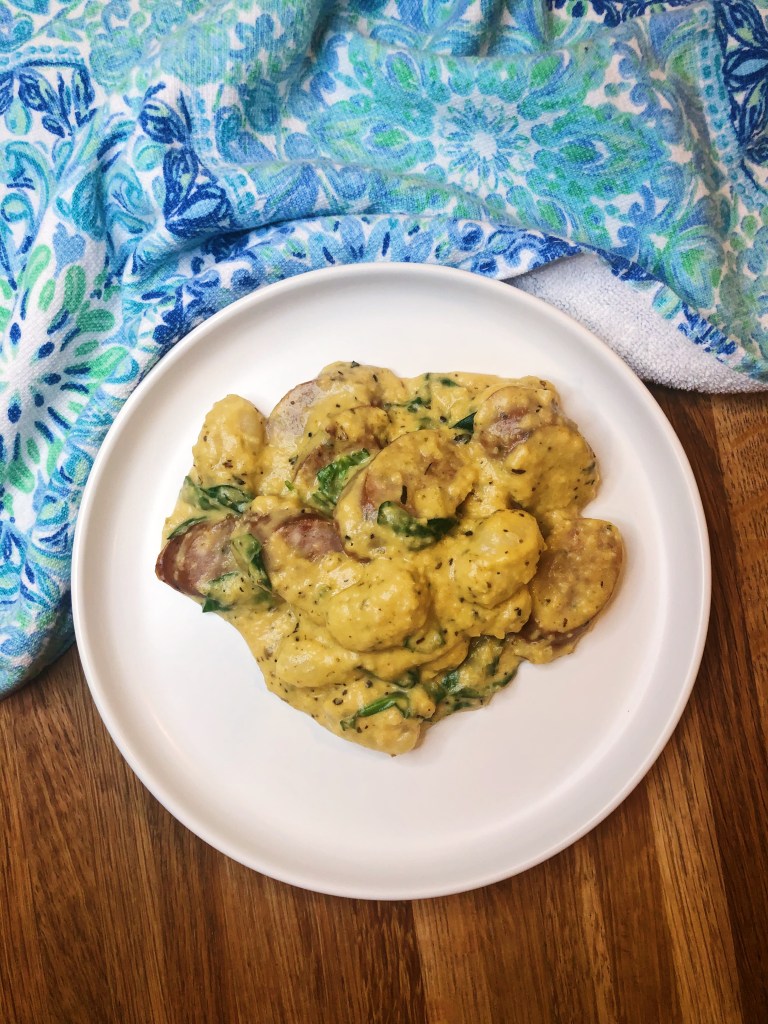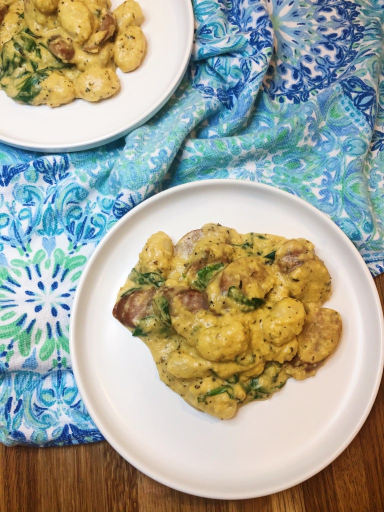 Looking for a warm, creamy dish that just happens to pack some serious vegetables? This sauce is made with butternut squash and will fool even the pickiest eaters – seriously it is that good! The squash has a slightly sweet flavor to it, so you won’t believe you are eating veggies. I have also managed to sneak in some spinach in this recipe for an extra serving of greens! This recipe would also be a great vegetarian alternative, just skip adding the chicken sausage – you could replace it with tofu or skip it all together! The gnocchi and sauce are decadent all on their own and don’t need much else.