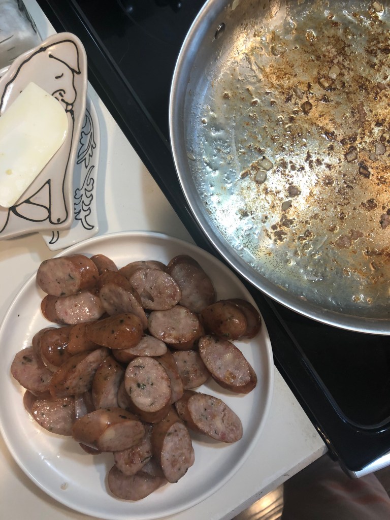 - Once the sausages start to brown, remove them on a plate and set aside. Turn the heat off.