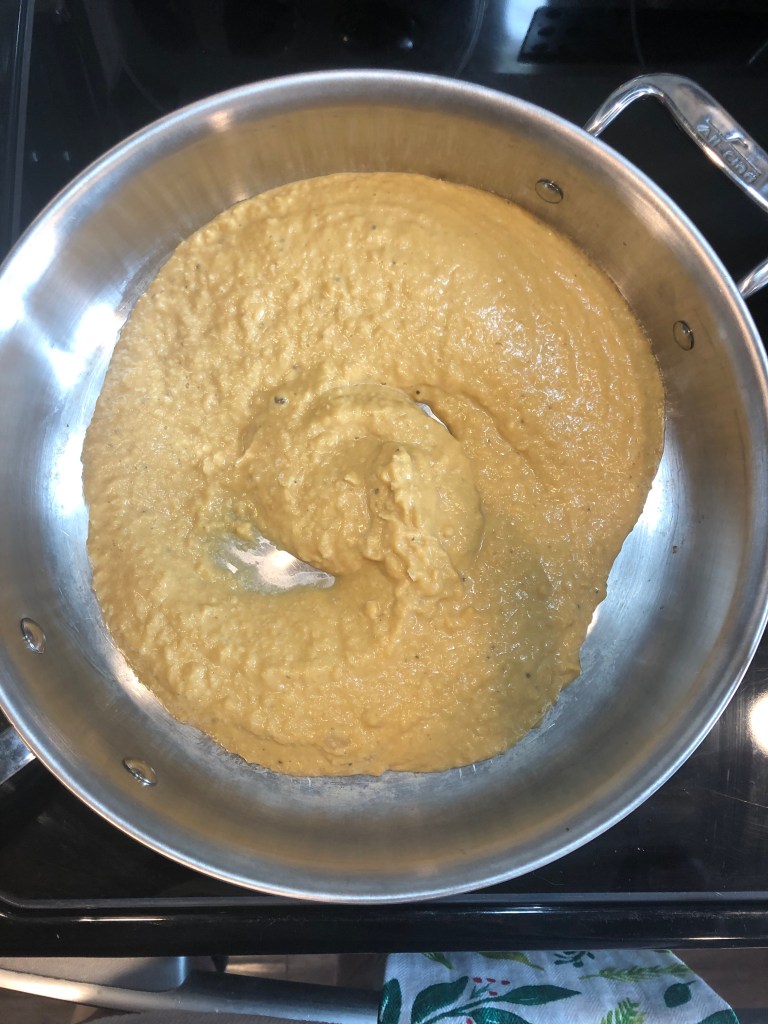 - While you are waiting for the water to boil, return the earlier pan to the stove and turn to low heat. Pour in the squash sauce.