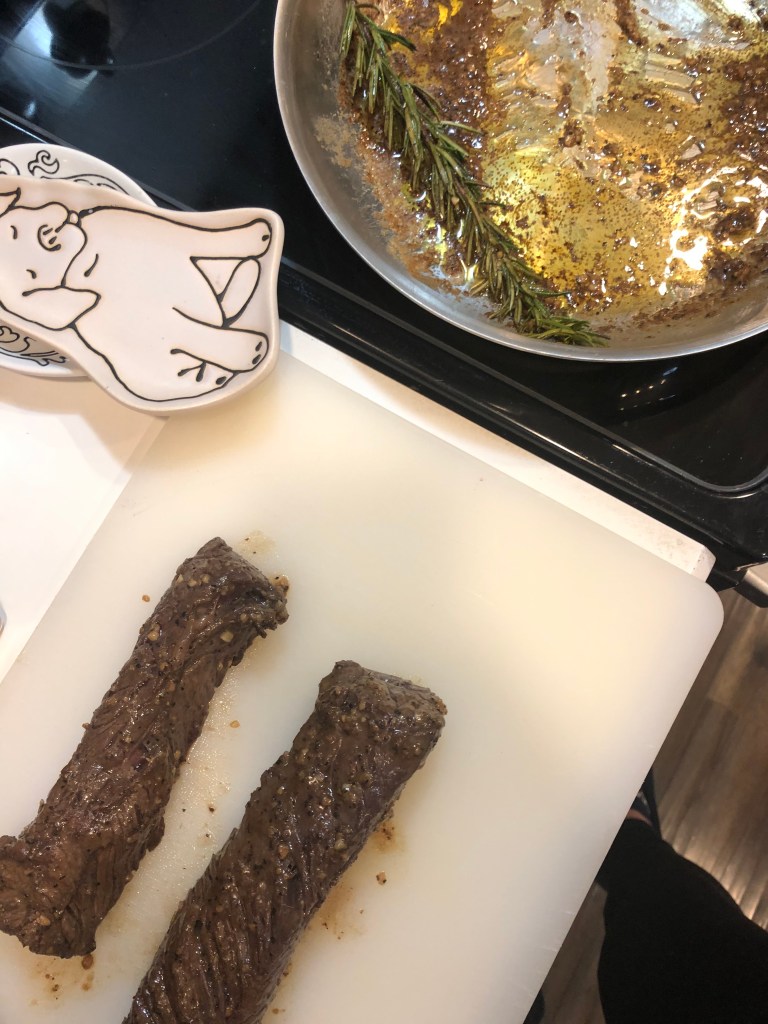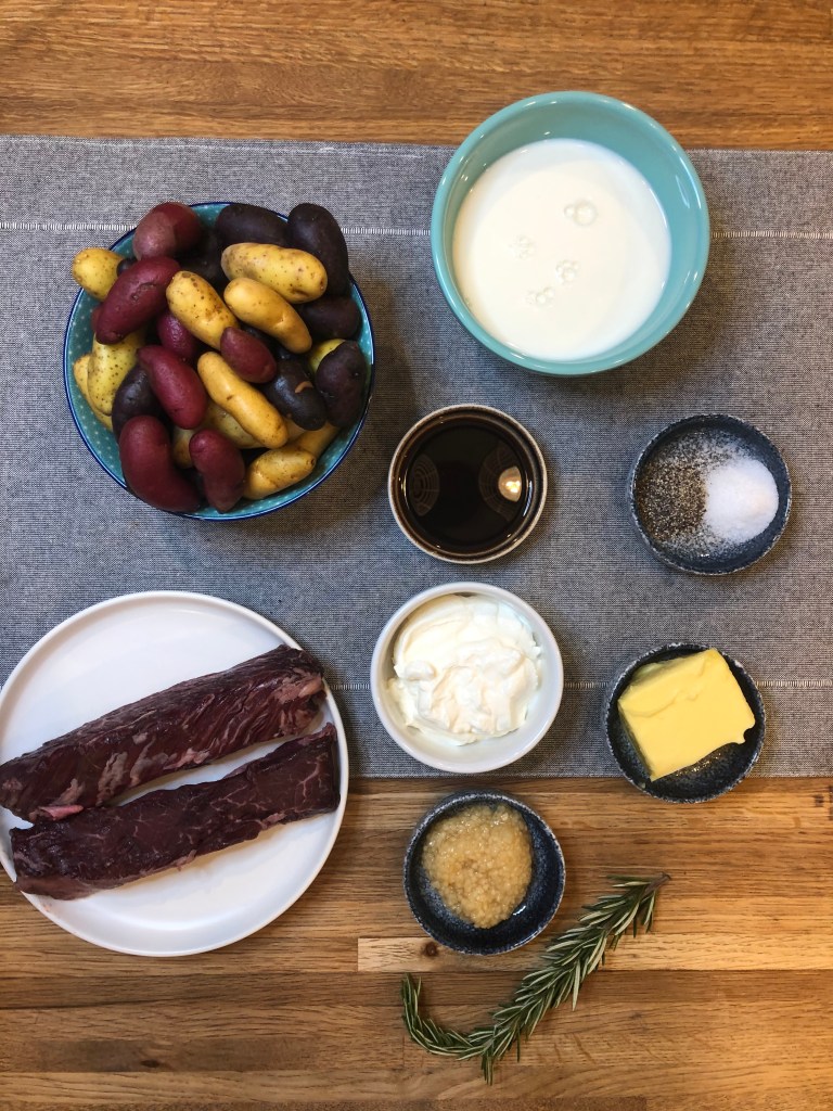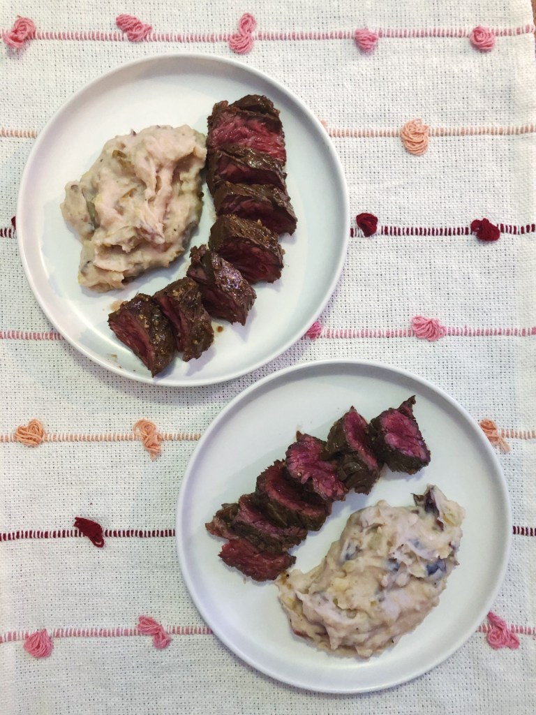 I have to confess, I had never heard of Hanger steak before a few weeks ago. I went to the grocery store, and while browsing the meat section I stumbled upon it. Out of curiosity, I asked the butcher what it was and he told me its one of the best cuts of meat and they used to only have them prepared as a custom cut! He told me it is more tender and flavorful than a filet…at this point I was intrigued but VERY skeptical. So I decided to grab two pieces and decide for myself if it was really all the hype. In order to really test the flavors of this meat, I decided to only use salt, pepper, and Worcestershire sauce to marinade and then cooked it in some butter, garlic, and rosemary – very typical for me when I have a good cut of meat! I have to admit, the butcher was right – it was incredibly tender and flavorful and my only regret is not knowing about this cut sooner! A benefit of the hanger cut is that it is much better price point than filet, but in my opinion you get much more so it is definitely my new favorite right now. I paired this dish with some garlic mashed potatoes because lets be real, steak and potatoes are an amazing combination. This dish is warm, creamy, buttery and indulgent. It is also easy enough to whip up on a weeknight so you don’t have to wait until the weekend to indulge in a Steakhouse classic!