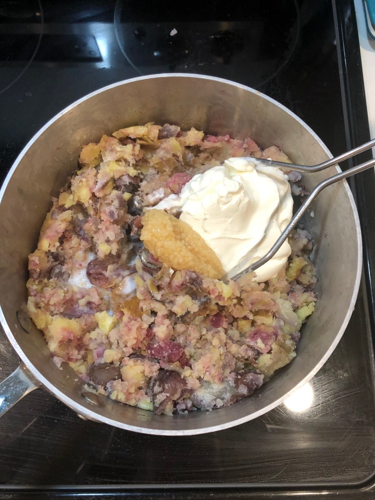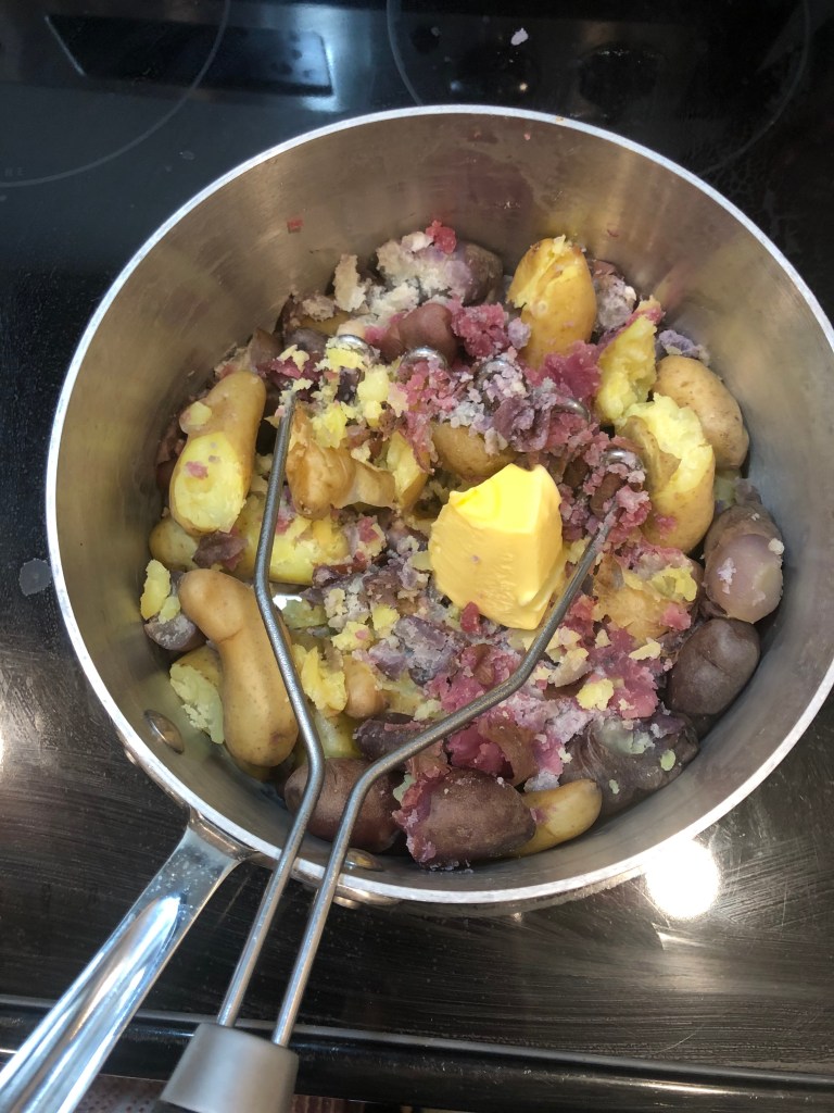 - Add in the 3 tbsp of butter and lightly mash the potatoes.