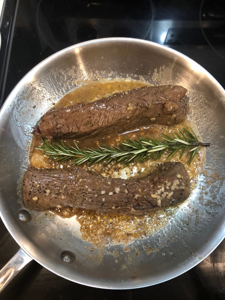 - Flip and sear on the other side and add in the garlic and rosemary.