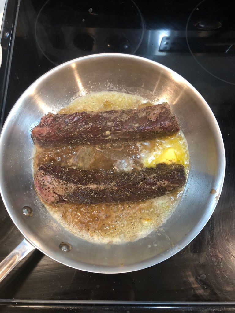 - Once the butter is melted, add the steaks and sear for 2 minutes.