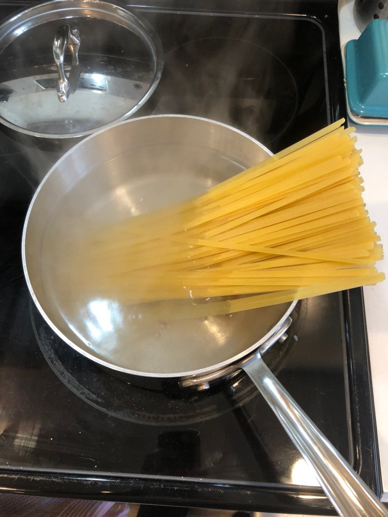 - While the wine is reducing down, bring a large pot of generously salted water to a boil and add in the linguine – cook until the pasta is al dente, about 5-8 minutes.