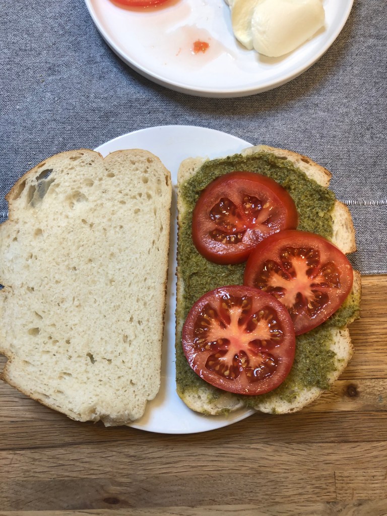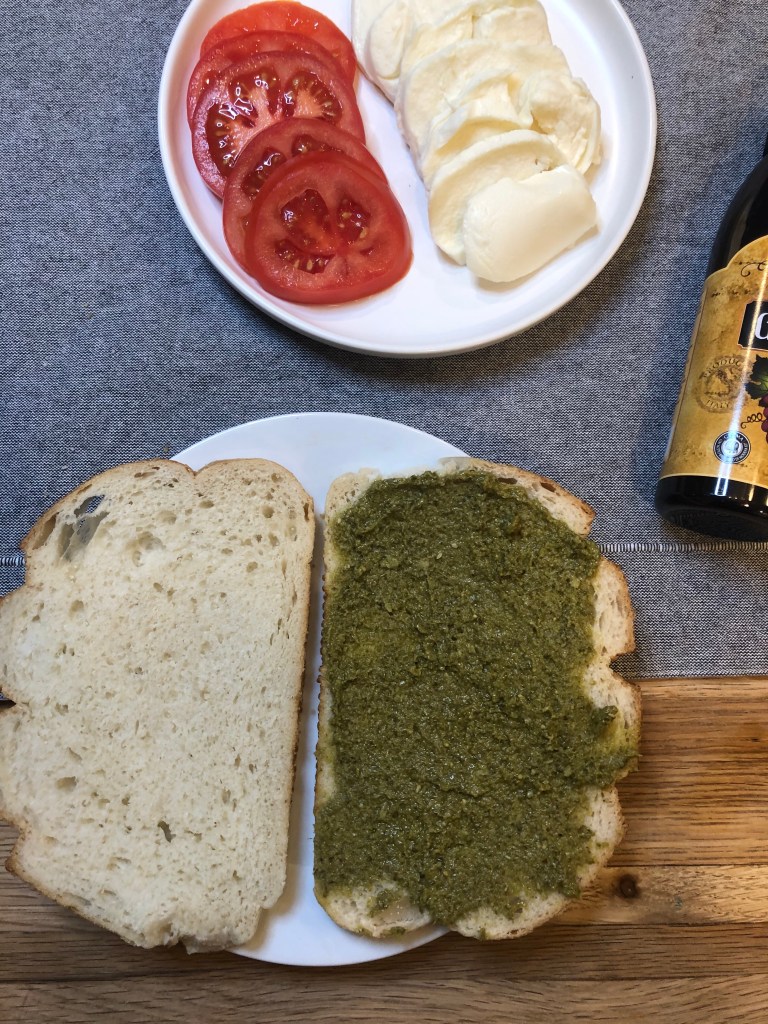 - Spread 1/8 cup of the pesto on one side of the bread.