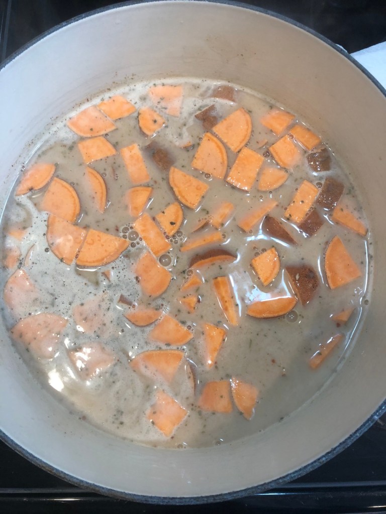 - Once it begins boiling, add in the sweet potatoes and peas.