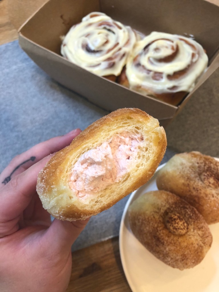 So are these worth all the hype and challenge to taste them? ABSOLUTELY! Like wow! Like I mentioned above, they currently offer 4 flavors – Creme Brûlée, Everything Bagel, and two rotating flavors. The Creme Brûlée is filled with a decadent vanilla bean creme and has a torched sugar coating on the top. It was incredible – light and airy but still rich and flavorful. The sugar coating on the outside perfectly mimicked that hard shell on a creme brûlée and added an incredible crunch! The Everything Bagel was probably my favorite – it is a savory donut, which is unique. It is also light and airy, filled with a whipped chive cream cheese and topped with everything bagel seasoning.