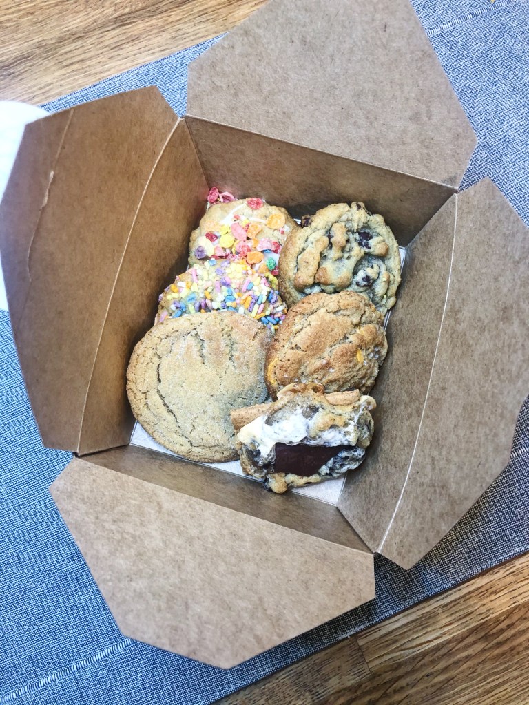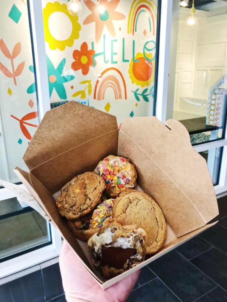 We opted for a half dozen ($10.50) so we could try a variety of flavors. We grabbed a classic chocolate chip, browned butter snickerdoodle, birthday cake, mackles’more, salted butterscotch, and the current seasonal pebbles of fruity. WOW OH WOW! These cookies are unreal! Soft and chewy and full of flavor. These didn’t last more than a night at our house because they were so incredible we just couldn’t stop eating them! My favorite was the mackles’more – both a mouthful to say and eat! If you don’t get the reference, it is a s’mores cookie topped with a big piece of Their chocolate. It is chocolatey, gooey, and a little crunch from the graham cracker. I love s’mores so its not a surprise this was my favorite. Could eat a dozen of these in one sitting, by myself – no shame! The browned butter snickerdoodle was a very close contender though – this was my husbands favorite. Browned butter makes everything taste better and these cookies are no exception. The browned butter gives a slightly nutty flavor and then you’ve got the sweetness from the cinnamon and sugar – masterpiece! I have always used browned butter in my chocolate chip cookies, but never did I think about using browned butter for anything other cookie flavors…I guess that is why Robin has a cookie shop and I do not lol. Both my husband and I put the salted butterscotch as our last place winner – not that it wasn’t still delicious, butterscotch just was not our cup of tea. The salted part did add a nice balance to the overly sweet butterscotch though. You can’t go wrong with their chocolate chip though – definitely a solid choice. While I think their chocolate chip is delicious, I prefer some of their other flavors because they are more unique and not as overhyped. Don’t get me wrong, I love a good chocolate chip cookie – but they are everywhere! So you have to make like REALLY good chocolate chip cookies for me to get super excited about and to give you a high praise. I think I make some delicious chocolate chip cookies, but I know I cannot make a delicious snickerdoodle or birthday cake – so I wold opt for those!