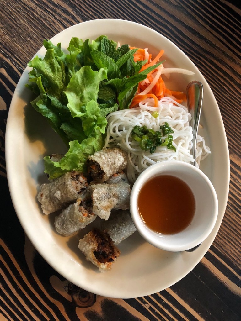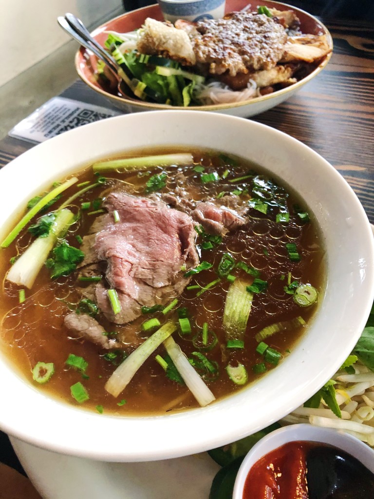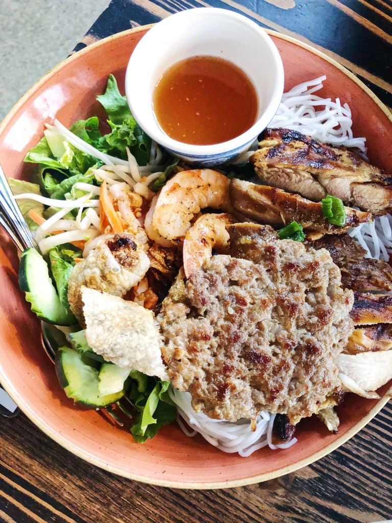 We ordered the special because how can you pass up Wagyu Pho( $19)?! We also ordered Crispy Imperial Rolls ($12) and the Combo Vermicelli Noodle Bowl ($17). The Imperial Rolls comes filled with pork, prawns, mushrooms, and mint. They are served with lettuce, pickled daikon and carrots, noodles and fish sauce. You are supposed to take the roll, place it in the lettuce and add some of the pickled veggies and noodles and top with the fish sauce – then roll it all up and eat it! It was delicious – the rolls by themselves were incredible, but adding all the other elements really kicked them up a notch! They are crispy, light and refreshing! Absolutely loved them and recommend starting your meal off with them. The Combo Bowl comes with chicken, shrimp, beef&pork sausage, vermicelli noodles, lettuce, bean sprouts, cucumbers, mint, pickles, roasted peanuts, crispy shallots and fish sauce. Sound like a lot going on there – but you get to try so many flavors! It was also delicious – this is what my husband ordered though and he would only share a few bites because he was so in love! Lastly, the Wagyu Pho – this was a special so unfortunately it is not on their regular menu, but there are a ton of other pho options that would be just as delicious! Their pho broth is slow cooked for hours to achieve that oh so good taste that leaves you doing a little happy dance! Their pho was incredible – absolutely hands down some of the best I have ever had!