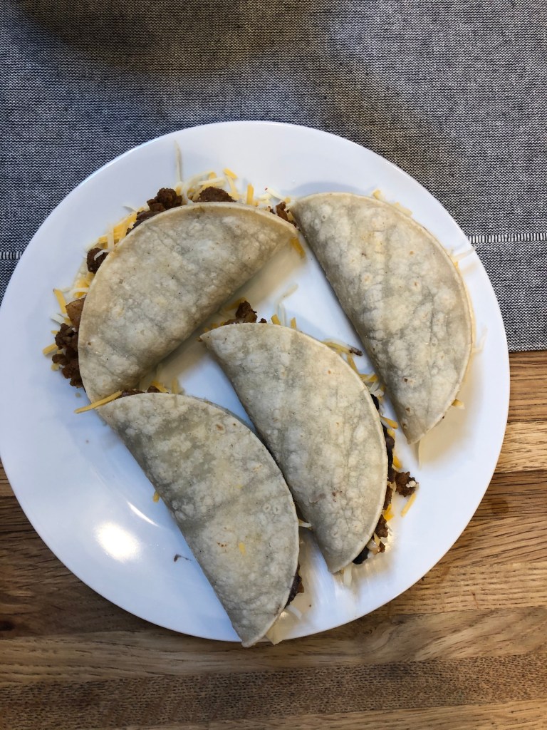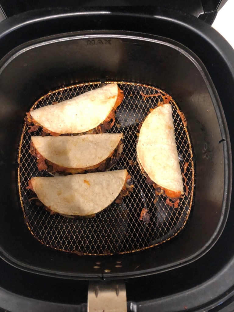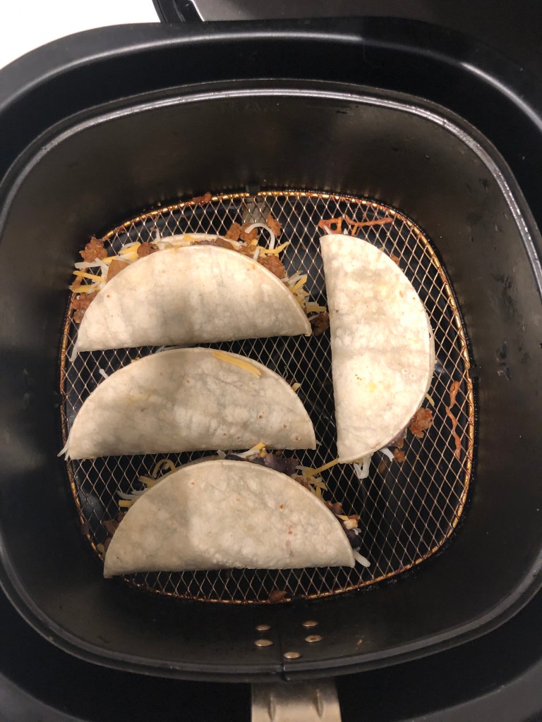 - Place in the air fryer on 350 degrees for 5 minutes and then flip and place back in for another 5 minutes until the tacos are nice and crispy!