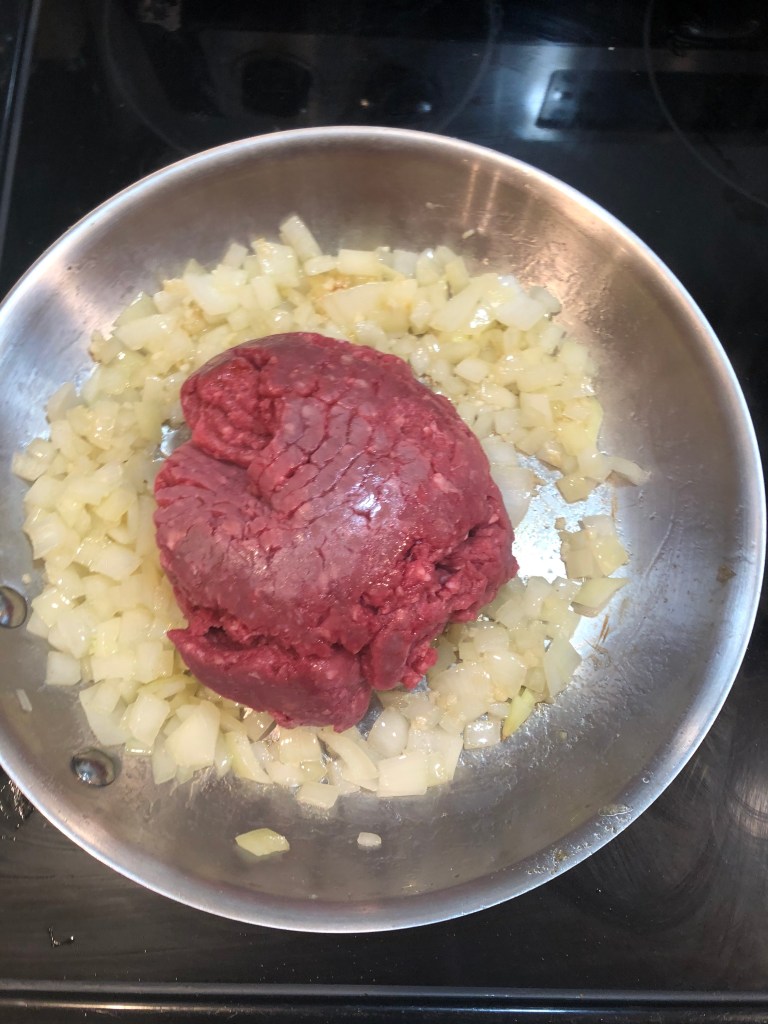 - Next add in the ground beef and cook for 8-10 minutes until no pink remains.