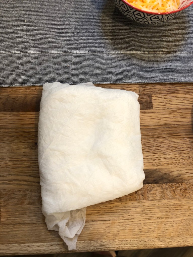 - (this next step might sound odd, but trust must it’ll help the tacos from cracking). Dampen a few paper towels and wrap 4 corn tortillas in them – you will need to do this in batches. Pop them in the microwave for 30-45 seconds to warm them – they become more flexible when they are heated and the damp towels help keep the moisture to prevent them from drying out.