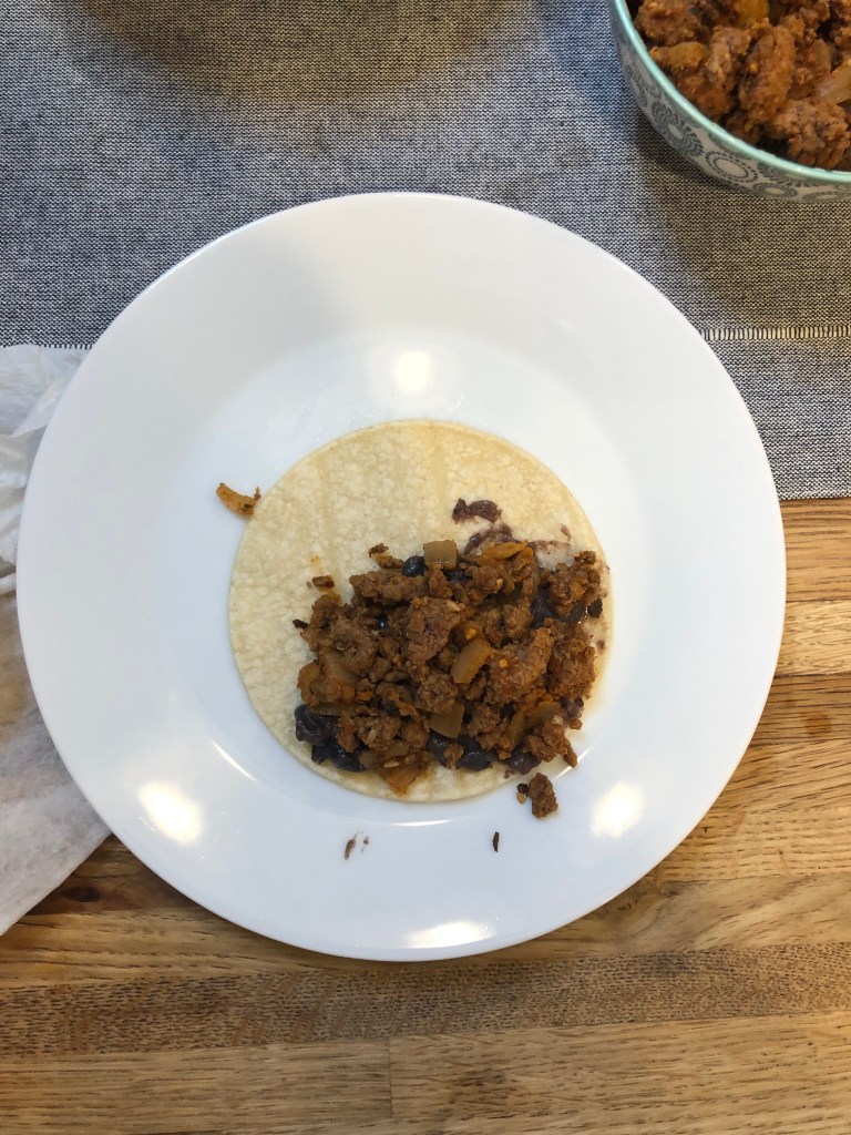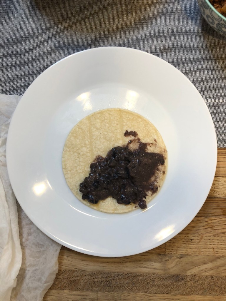 - Take 1 corn tortilla and place a spoonful of black beans on one side.