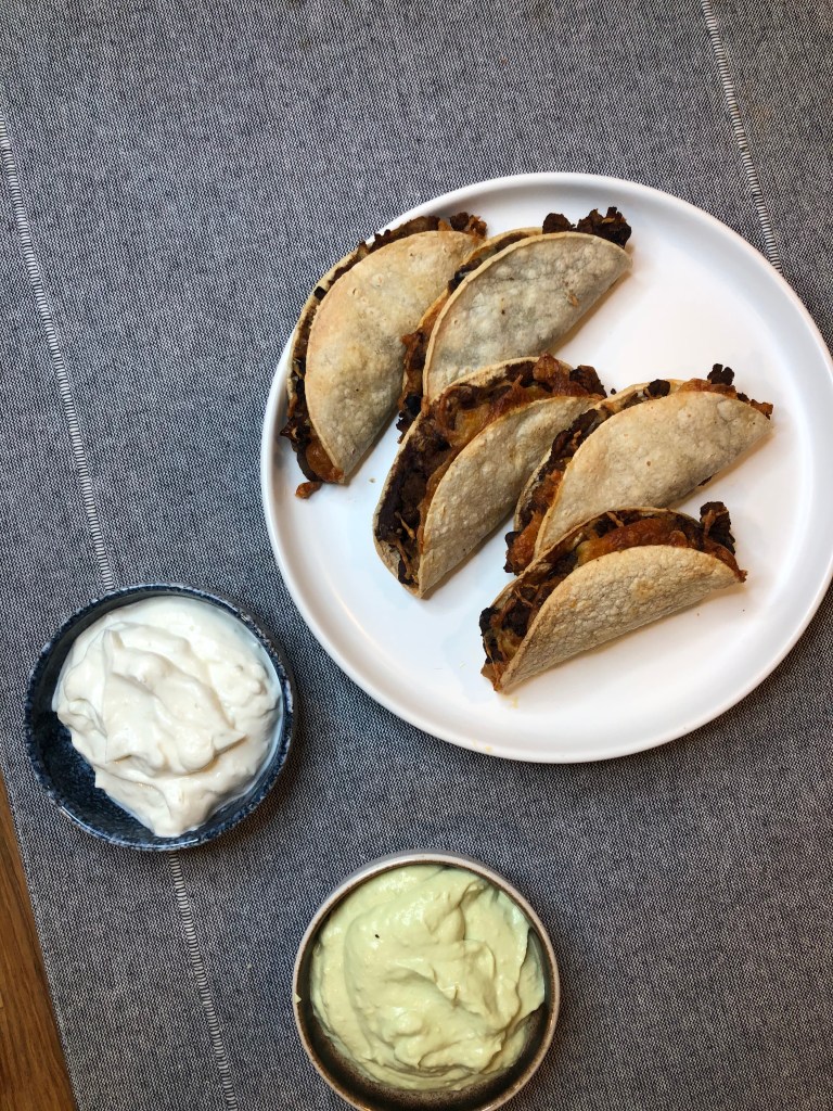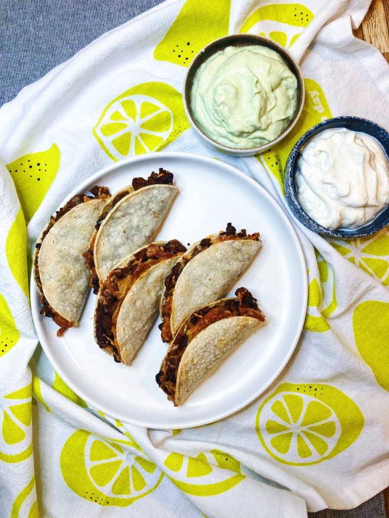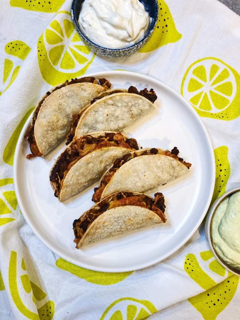 I have a hard time choosing between crispy and soft tacos. I love me a good street taco on a soft corn tortilla. But there is something about that crispy taco shell that just feels right when you bite in to it. These are kind of in the middle of the road. They have a great crisp on the outside, but still have that soft tortilla once you bite in to them, giving you the best of both worlds! I made these using an air fryer to avoid oil – because New Years Resolution and trying to be healthier – but these can totally be baked on a sheet pan in an over, or deep fried on some oil! Any way you choose to make them will be equally delicious. Upon biting in to these crispy delights, you will find soft beans, perfectly seasoned beef, and melty cheese. But, what makes these pop even more is the lime crema on the side. It adds the perfect tanginess and acid that you need for these. I mean if I’m being honest, what is a street taco without some lime juice?! Or a crispy taco without sour cream?! It’s just not the same. These tacos are also great for a party and perfect bite-sized options for everyone. You can make them in large batches and ahead of time – then when you are ready to serve, just pop them in the air fryer (or oven) for a few minutes and you’re ready to rock and roll! Try these for your next Taco Tuesday!