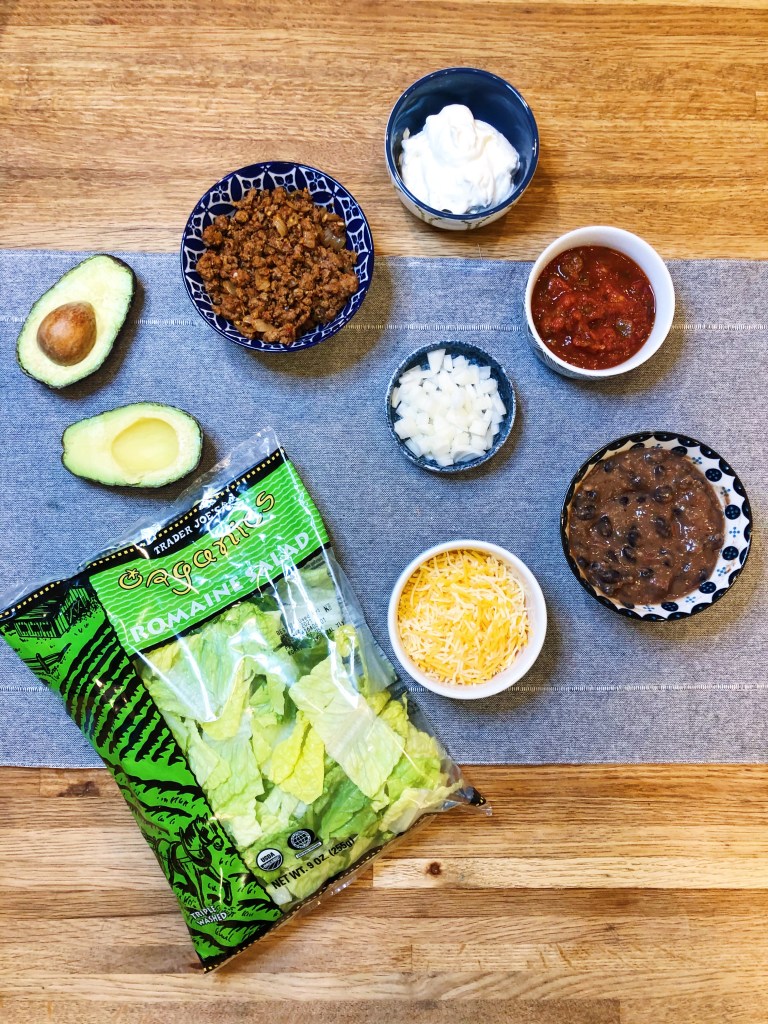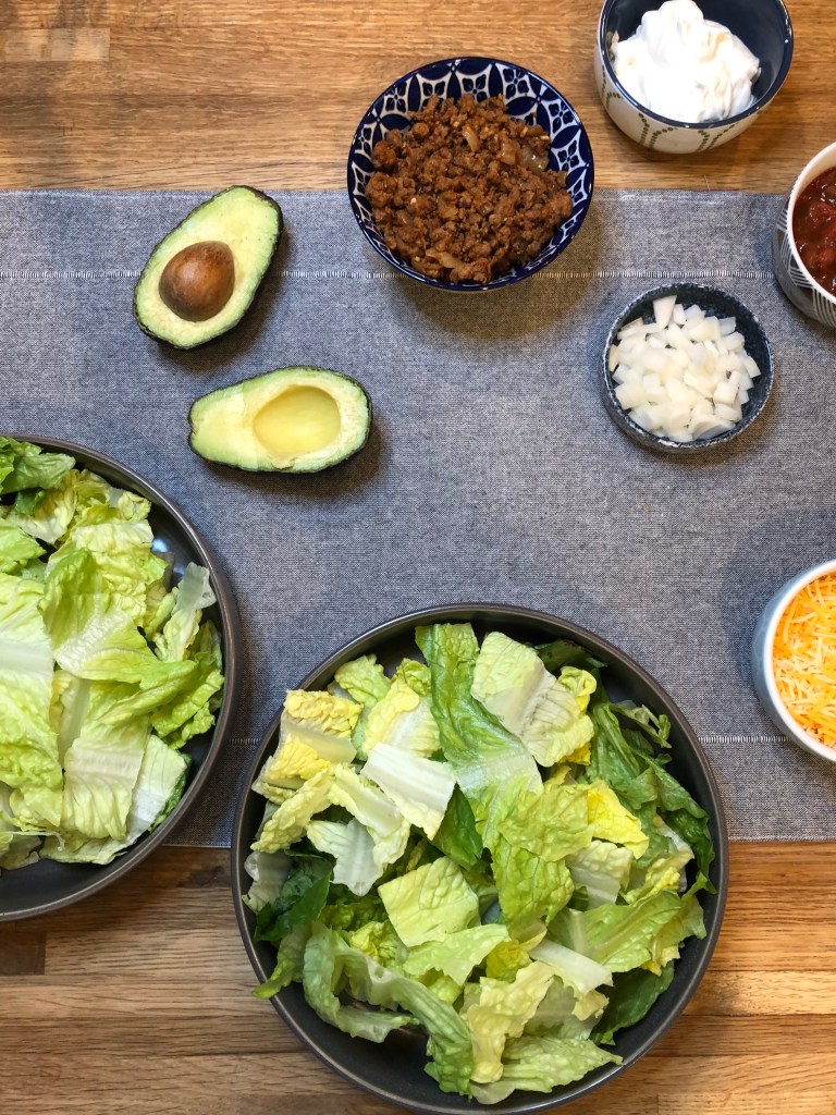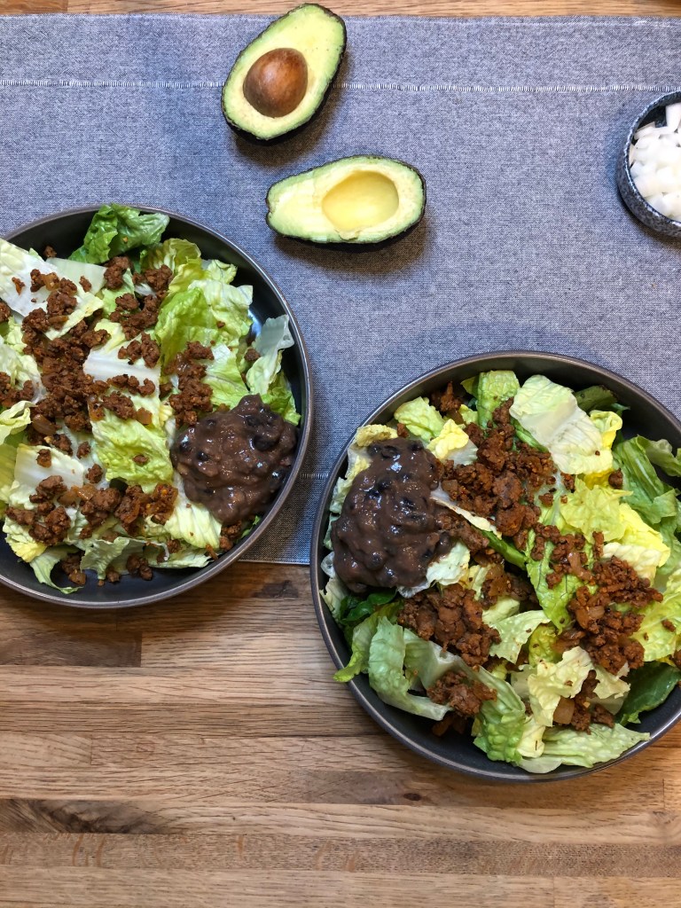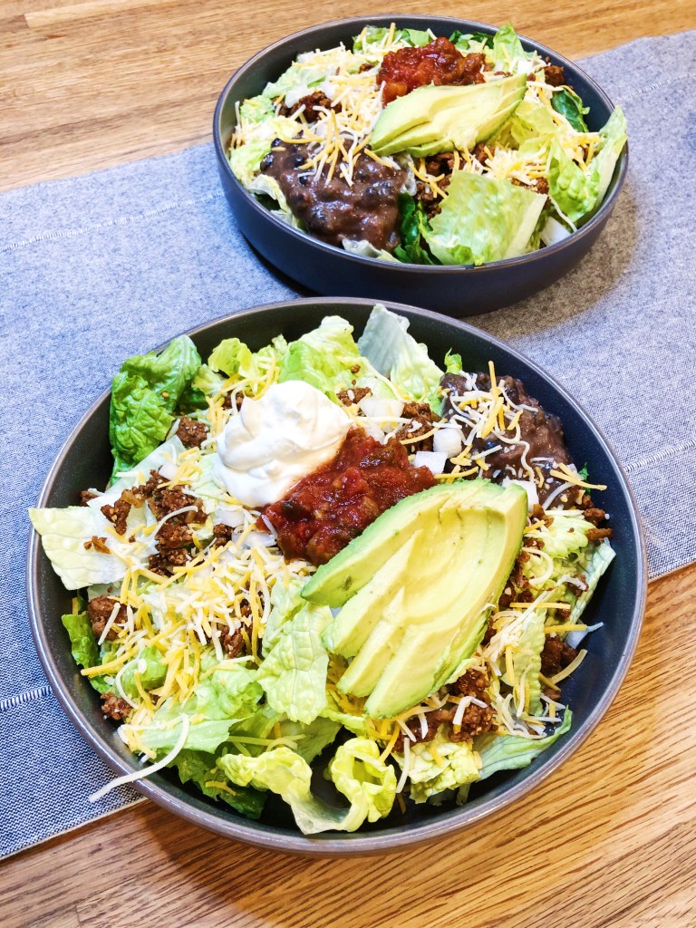 Taco Salads are great – the have all the wonderful taco fillings with a little less guilt, less carbs, and more veggies. Growing up, my mom used to make taco salads almost every week! I loved them – they are easy to throw together and you can add just about anything. I prefer mine on the simpler side – meat, beans, cheese, sour cream, salsa, and don’t @ me for this but a little bit of ranch. Growing up in the midwest, ranch is not uncommon on a taco salad. In fact, one of my favorite places to get a taco salad from serves it with ranch – so for all of you purists out there, thank you but no thank you, I will keep my ranch! My husband definitely shaded me for adding ranch so once he comes to his sense that ranch is in fact superior, he will be allowed to sleep in the house again (LOL please know that I am completely joking here if you could not tell by my sarcastic demeanor)! The taco salad really is the lazy version of tacos, but I am so here for it. Its crunchy, cheesy, creamy, spicy – just all around a good time. Try this for your next Taco Tuesday or when you want to switch up those taco seasoned meat leftovers.