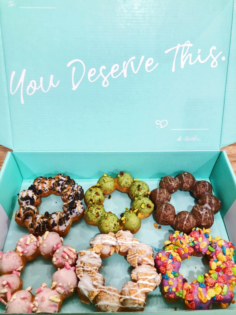 What do you get when you combine donuts with mochi? DOCHI – mochi-donuts that are irresistible. Mochi donuts are not like your typical yeast raised donuts. They are light and chewy with a very different texture. Dochi is a popular Seattle bakery known for their mochi donuts and have some fun flavors! I also LOVE their boxes with “You Deserve This” because damn right I DO deserve this!