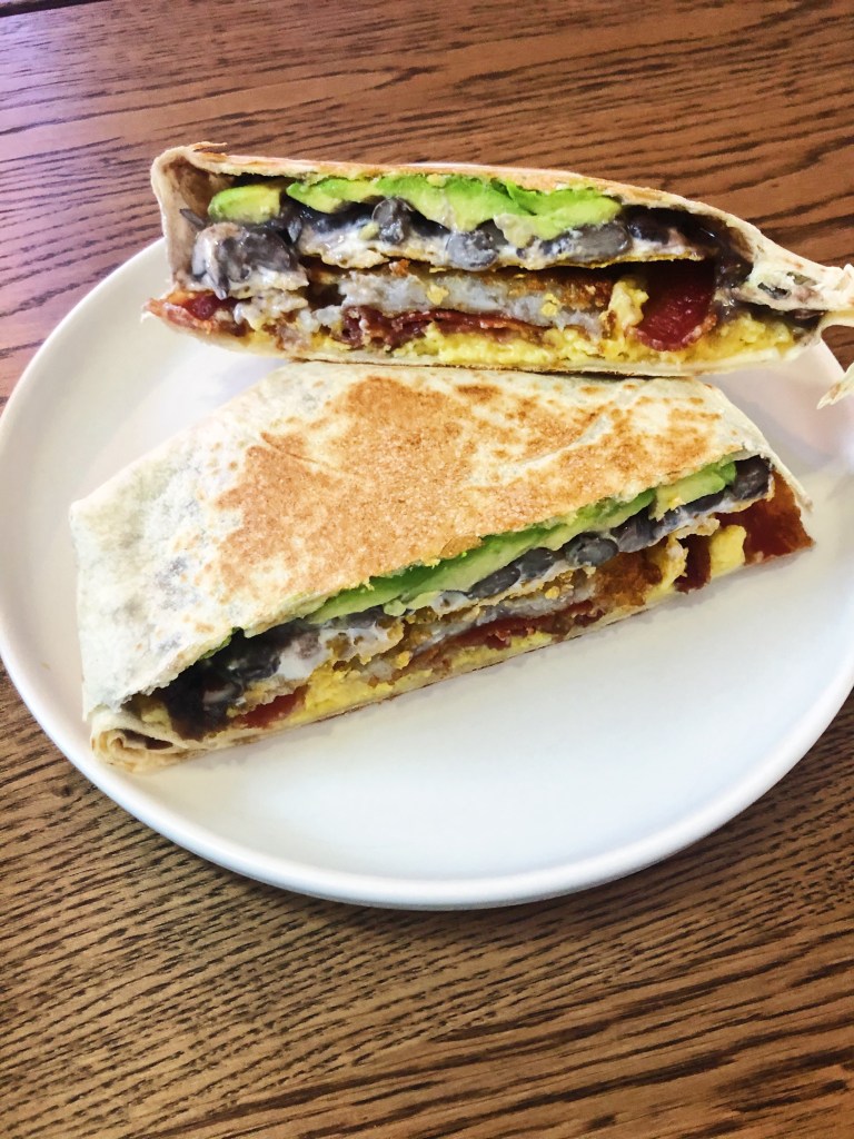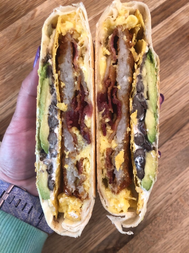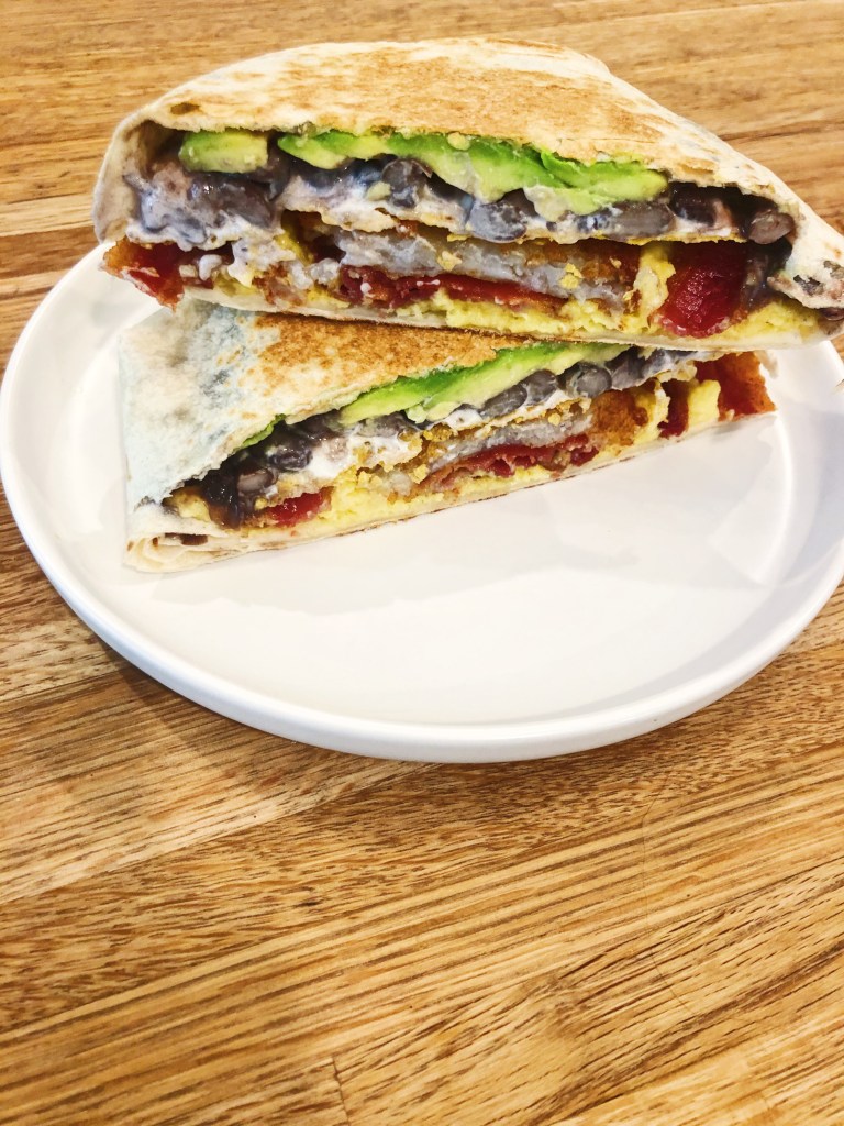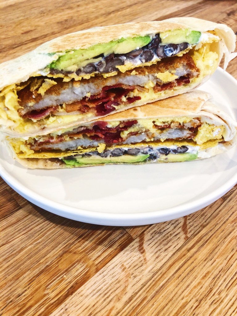 This recipe has all the best parts of breakfast wrapped up in to one – and its convenient to take on the go! I was inspired by the classic crunchwrap, but am a big fan of breakfast foods so I thought, why not? For mine, I packed it with black beans, avocado, sour cream, bacon, hashbrowns, eggs and cheese of course. This will definitely get your day started off on the right foot! This is probably one of my favorite recipes I have created thus far because i cannot stress how underrated breakfast foods are.