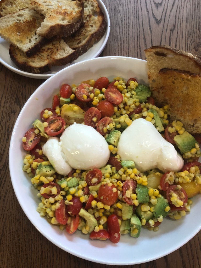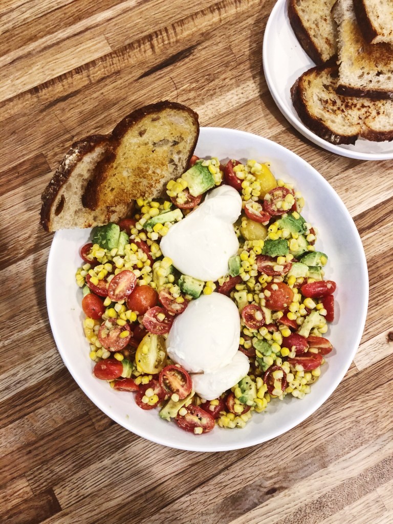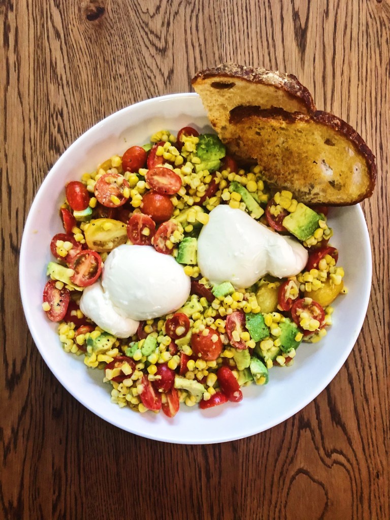 Summer time brings out all the vegetables! They are fresh, delicious, and plentiful. Spring and summer offer some of my favorites – including corn and tomatoes! This salad is a great side dish for a picnic, BBQ, or a light dinner at home. It is refreshing, crunchy, and creamy. It also comes together quickly, which makes it perfect for on the go. You can swap fresh corn for frozen or canned, but I highly recommend taking advantage of the season and using fresh. It has a better flavor and texture and adds so much color to the dish! The burrata also adds a great creaminess and elevates the dish to the next level to provide more flavor and texture. Grab a piece of bread, spread on some burrata and top with the corn, tomatoes, and avocado for an absolutely perfect bite!