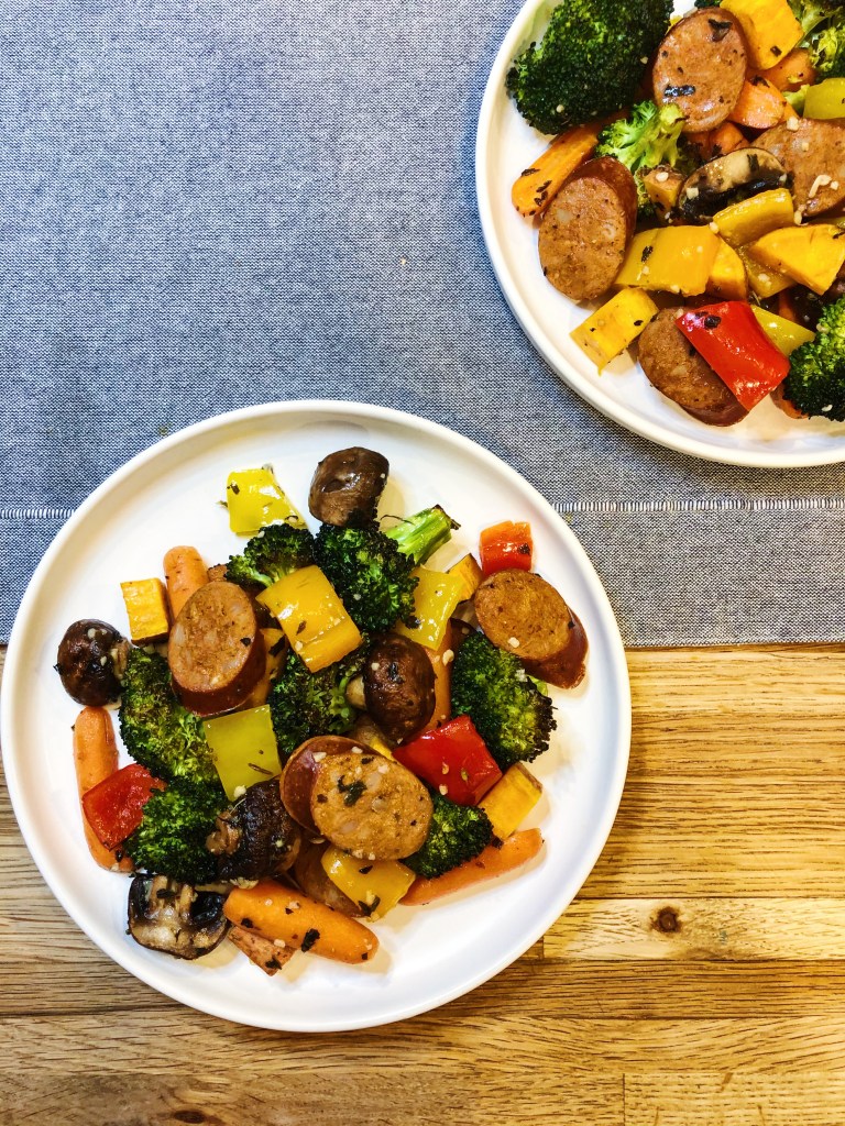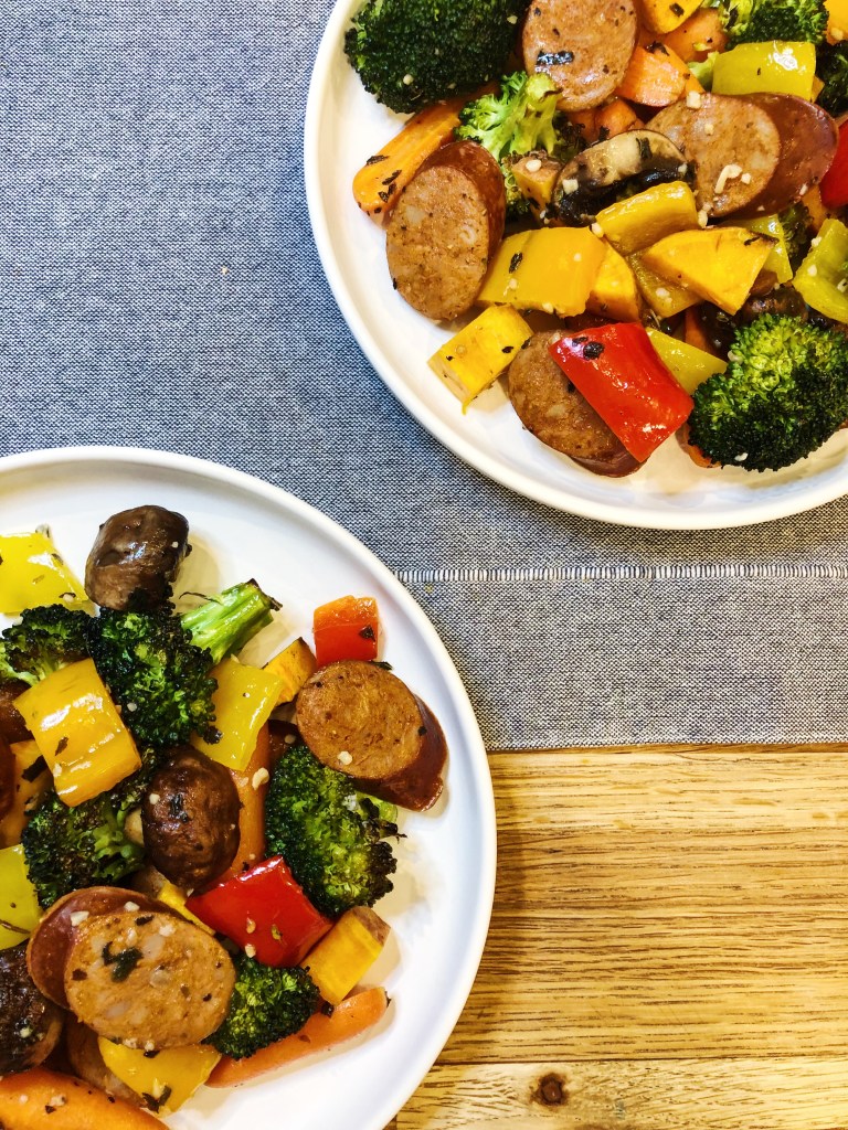 Who says healthy food needs to be boring or flavorless? Now that spring is approaching and soon summer, I am sure we all find ourselves craving more fresh vegetables and lighter meals – I know I do! This sheet pan roasted veggies are perfect for the spring and cooler months! It is full of flavor and nutrients that won’t leave you bloated or in a carb coma. It is also a great dish that requires very little clean up – you just throw everything on a pan and BAM! you’re done – and if you use foil it makes cleanup even easier. You can also totally swap the vegetables for ones that you or your family is more likely to eat – not everyone loves mushrooms or bell peppers! You can also make this 100% vegetarian by omitting the chicken sausage – can be substituted with tofu or meat alternative if you’re wanting more protein and a more substantial dish. I love this recipe because it is easy, delicious, healthy, and requires minimal clean up or prep.
