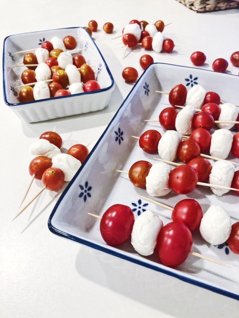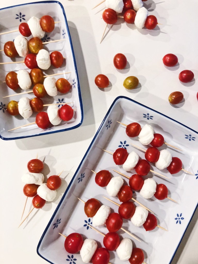 - Take a toothpick add a tomato, mozzarella ball, then another tomato.