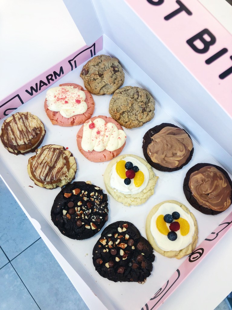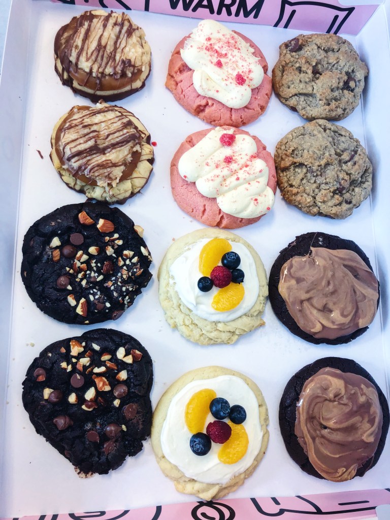 The week that I grabbed a box, they offered Oatmeal Chocolate Chip, Peanut Butter Brownie, Strawberry Shortcake, Coconut Caramel, Rocky Road, and Chilled Sugar with Fruit. The Rocky Road was probably my favorite with a 3-way tie between Oatmeal Chocolate Chip, Coconut Caramel, and Strawberry Shortcake! The Chilled Sugar was also delicious and had a wonderful sour cream frosting on top. My least favorite by far was the Peanut Butter Brownie, which is a shame because I love peanut butter and brownies, but this cookie was just too rich and a little dry. It was better heated in the microwave for a few seconds, but it was just too much – I think if the cookie had more of a brownie-type, chewy texture they would have nailed it. If you are lucky enough to have a location near you or delivery near you – definitely check them out and follow them on instagram for their flavors since they change almost weekly.