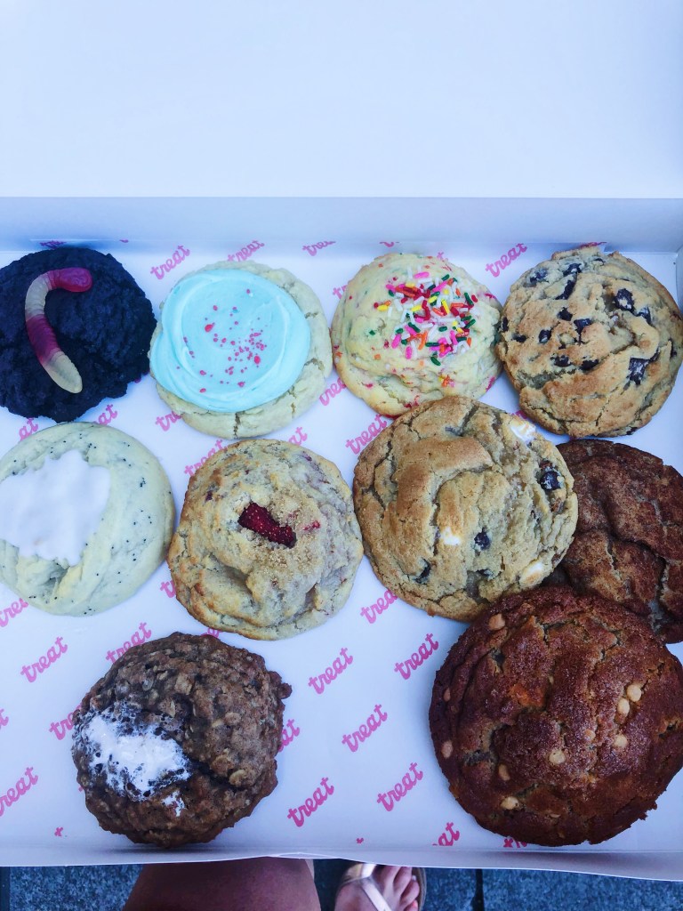 Treat yo self – my favorite line from one of my favorite TV shows, Parks and Rec. I try to live my life by this phrase becuase life is too short to not eat the damn cookie! Treat is a fun cookie shop run by a mother-daughter duo. They’ve got delicious and creative flavors with people names! They also have a cookie club that you can subscribe to if you want cookies delivered straight to your house – how great is that? I stopped by becuase I just had to get my hands on these babies and per usual, I couldn’t decide which flavor to get so why not get them all?? I’ll get to all the flavors in a minute, but these cookies were BOMB. They were huge and soft on the inside with a little crisp on the edges – the perfect cookie. The flavors were also on point. Don’t eat them all in one sitting though or you will have a sugar rush and maybe an upset stomach becuase these babies are rich! I recommend sharing these with your friends, especially if you want to try them all. They are best consumed fresh so don’t let them sit around! So now to the flavors.