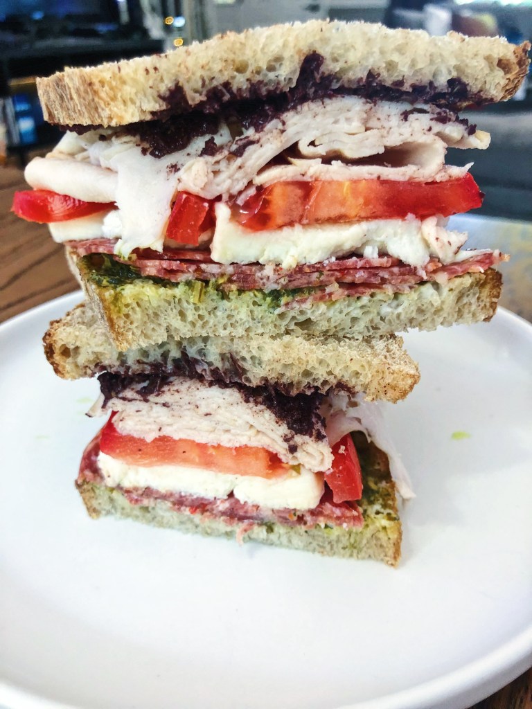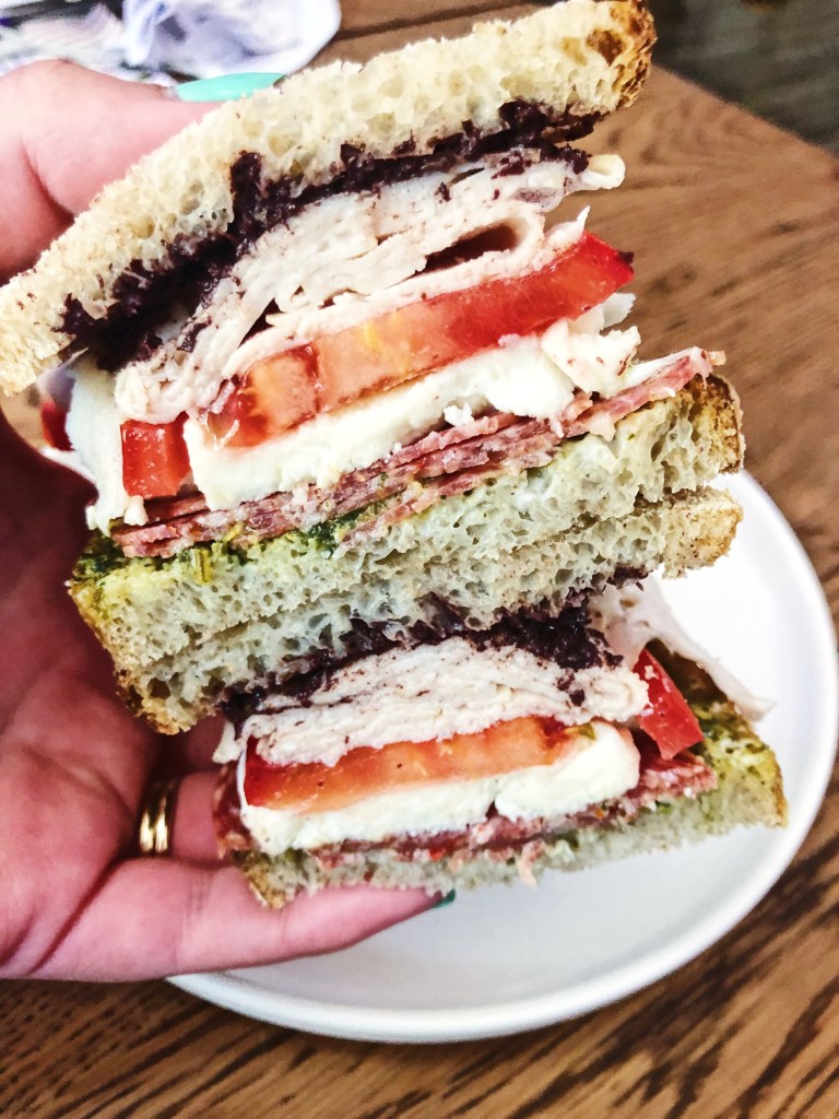 This is sandiwch goals – its got everything you want. Salty, creamy, crunchy, and fresh. It’s easy enough to make in the middle of the day but elevated enough to make you think you made something gourmet! It comes together super quick – the most work is slicing the bread and toasting it for a few minutes. I call this an Italian-ish sandwich because I took some very italian ingredients – mozzarella, pesto, olives, salami, and tomatoes – and put them together to create this. If you aren’t a fan of olives, you can easily substitute for a red pepper spread (Trader Joe’s sells a great one!) or a simple garlic aoili (basically just mix some mayo and minced garlic).
