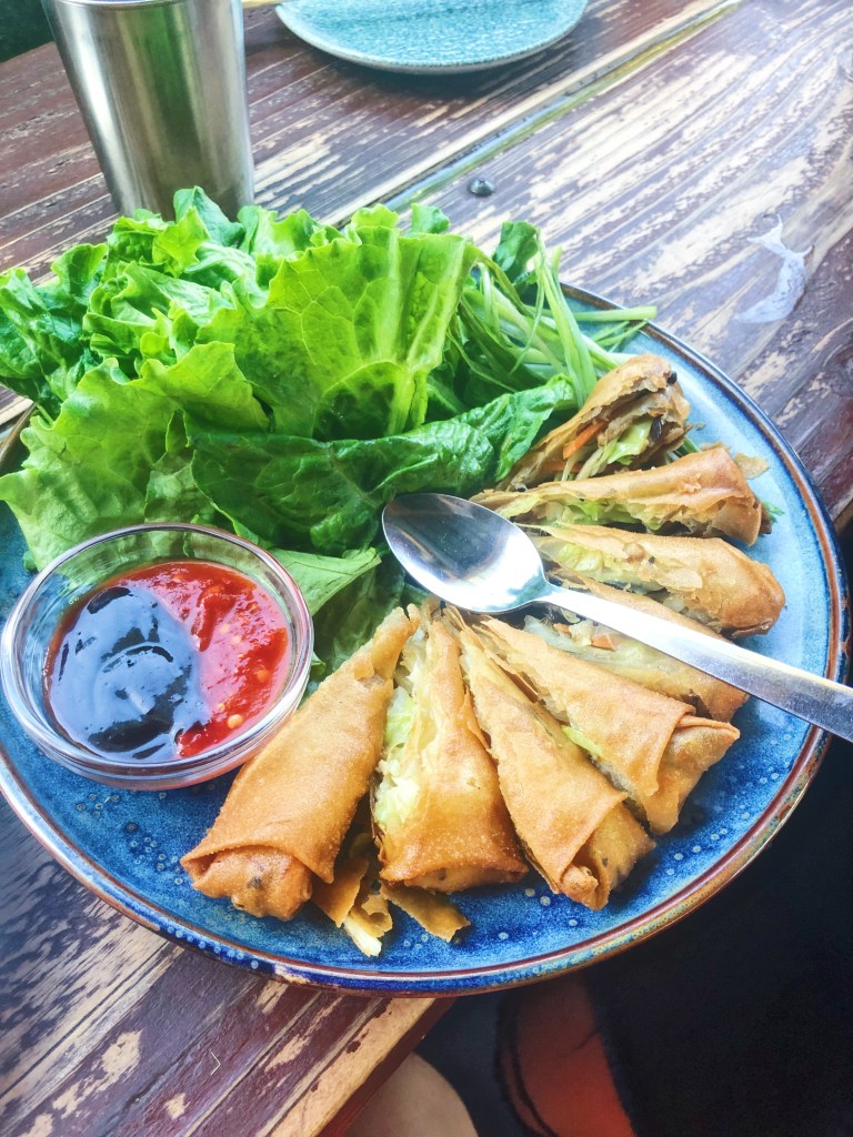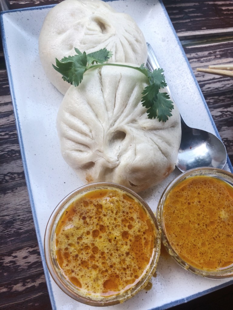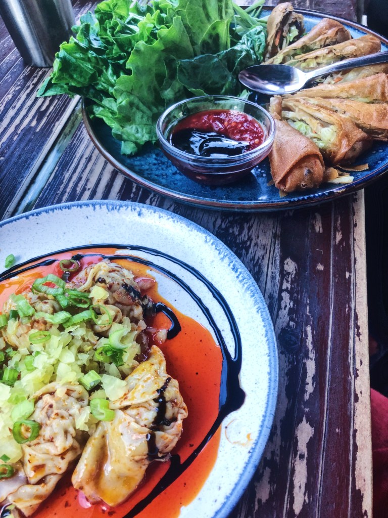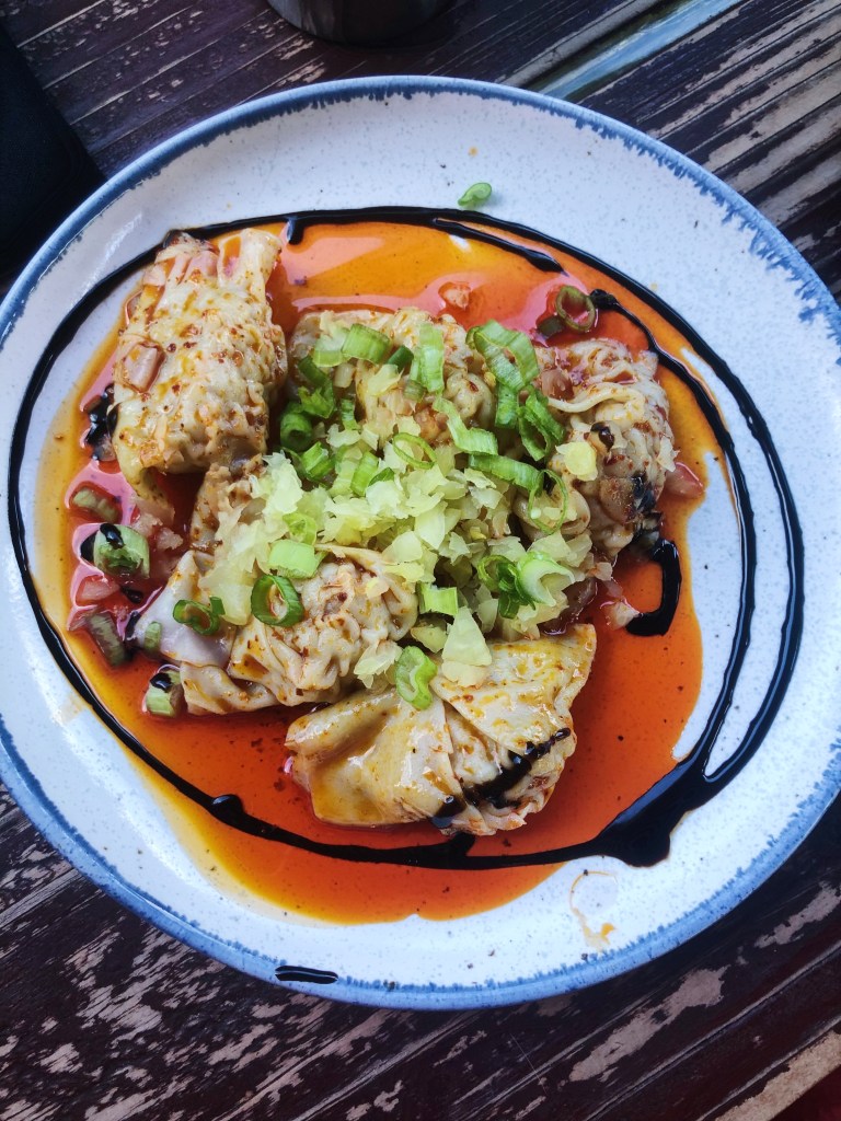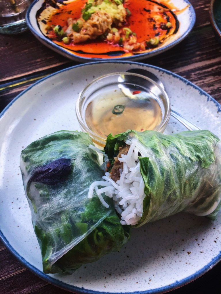 Now to what you are really here for – the food! Like I mentioned above, they have an incredible HH which is what we went for. We ordered a number of their small plates, – Bao, Mu Xu Roast Crispy Duck Rolls, Payapa Salad, Carmelized Pork Fresh Roll, and Shanghai Spicy Wontons. My top 3 dishes were the Wontons, Bao, and Crispy Duck Rolls. The Bao are filled with jidori chicken and mushrooms, then served with a coconut curry and kaffir lime leaf – its super delicious and a unique take on a traditional Chinese Bao that incorporates Indian flavors. Dumplings are one of my favorite food groups and their ShangHai Spicy Wontons deserve a medal – they could have broughten me a bucket of these and I would have been so satisfied. The dumplings are filled with snow crab, rockshrimp, and pork and served with a spicy chili oil and balsamic reduction. Super interesting flavor combination with the balsamic, but it cuts the heat and adds a depth of acid that works great! If you’re looking for lighter dishes, opt for the carmelized pork spring rolls and payapa salad – both were light, tasty, and refreshing! Don’t get me wrong, they were incredible as well, just not as incredible as the other things we ordered! There are so many more dishes on the menu I cannot wait to try – we barely made it through the appetizer section, so we must go back!