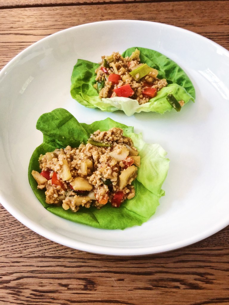I used to go to Pei Wei a ton growing up – if you aren’t familiar with it, it’s basically PF Chang’s lower end version that offers quick dine-in or take-out options in a cafe-type setting where you order at the counter. Anyways, growing up my mom and I used to frequent this place at least once a week – it was our tradition. We would share edamame, lettuce wraps, and usually a stir fry of some type! But our favorite was the lettuce wraps – so simple, healthy, and actually tasty. I haven’t been to a location in years, in fact where I currently live they do not even have them! I crave these chicken lettuce wraps all the time and this is my re-invention of them to make when I am missing my mom and feeling a bit homesick (let me also make it known that I am a grown adult, married with a job, house, and responsibilities – but I still miss my mom and my hometown all the time!). I love that this recipe is full of vegetables and it tastes good! You could also probably make this vegetarian by substituting tofu for the chicken – I cannot confirm since I haven’t made this, but for any of my vegetarian friends out there it could be a yummy suggestion! Anyways, this recipe comes together quickly so you don’t have to stress during the week night about making something that tastes delicious and has a nutritional value!