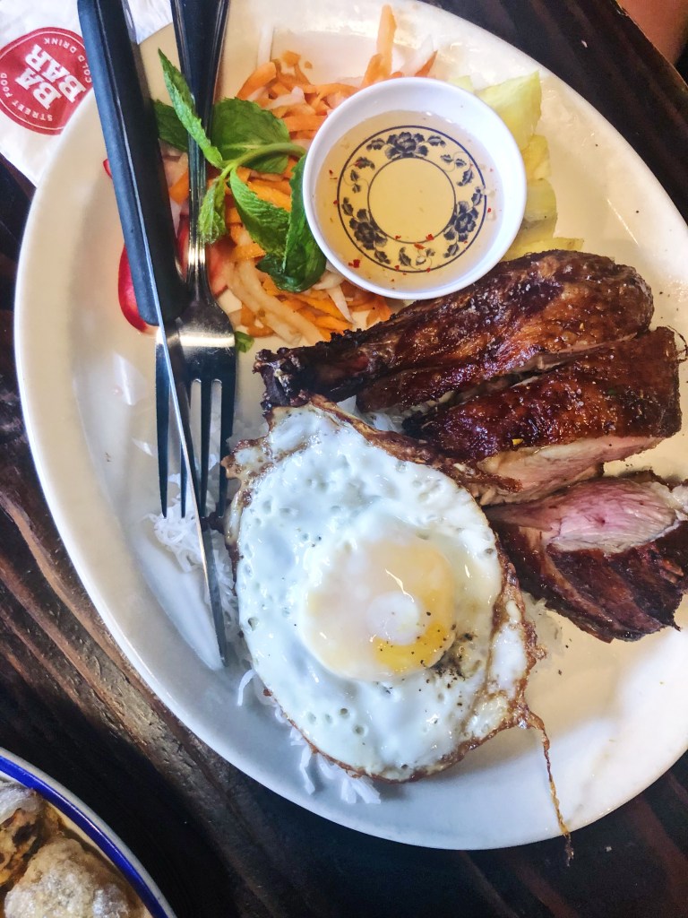 For an appetizer, we indulged in their Garlic Butter Prawns. It comes with 4 jumbo shrimp, with a tamarind glaze, garlic butter and served with a chinese doughnut. WOW – I could NOT get enough of this garlic butter. There was also a flavor profile reminiscent of the ramen seasoning packets that was dusted on the top that really worked well. These were so good I cannot recommend sharing a plate with anyone because you will fight over them and want to eat all of them yourself, so maybe just tell your friend or significant other that they ~aren’t very good so they shouldn’t try them to “save” them~ and eat them all on your own! For our meals, we ordered the Bun Cha Ca La Vong and Duck Supreme. The Bun Cha Ca La Vong is a vermicelli noodle bowl with Washington rockfish, crispy imperial roll, cucmber, dill, roasated peanut, carrot, shrimp sauce and of course the vermicelli noodles. I love their bowls becuase they are big enough for sharing, but also come with fresh ingredients and are light but also will keep you satisfied. The fish was cooked perfectly and was so flakey it immediately fell apart – exactly what ya want. The Duck Supreme is one of their slow roasted rotisserie options. It comes with duck breast, pineapple, fish sauce and your choice of noodles or rice, plus you can get a fried egg on top – which I highly recommend. What should we order next??