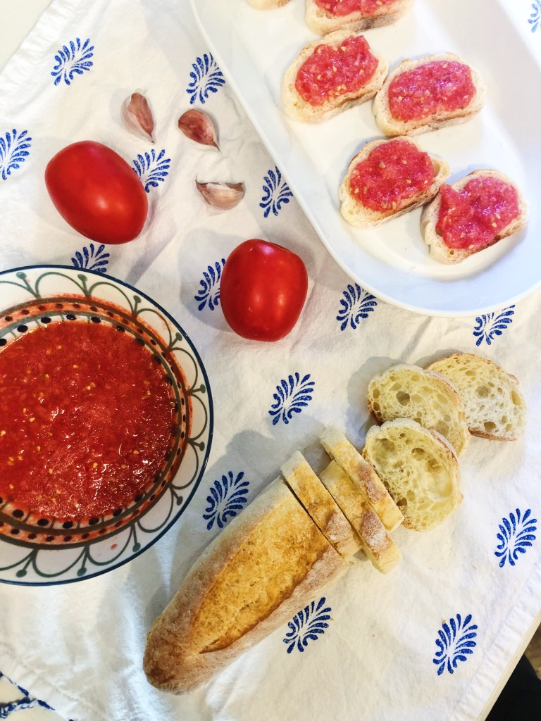 I was first introduced to this dish when I traveled to Spain. I was a bit shocked when I saw tomatoe bread on the menu becuase I thought, who the heck would order that?? I actually did not try it until I went to dinner with a few friends and we ordered a bunch of tapas for the table. This was one of the dishes ordered that was apparently a staple of tapas. It was incredible – so simple, yet somehow left me wanting more and more. Over the years, I have craved that simple dish and learned how to re-create a version of it. I am not claiming this is authentic and there are so many different versions out there that use different tomatoes or additional ingredients and even different ratios. This however is my version that brings me back to Spain and to me, tastes just like the first time I ate it – that is what cooking is all about anyways, right? Flavors and ingredients that remind you of some memory. I frequent tapas restaurants whenever I can and this is hands down always one of my favorite dishes – there is just something about it! Give it a try and let me know what you think. Is it really as good as I am making it, or do I just have such great memories of my time in Spain I am holding on to this dish.