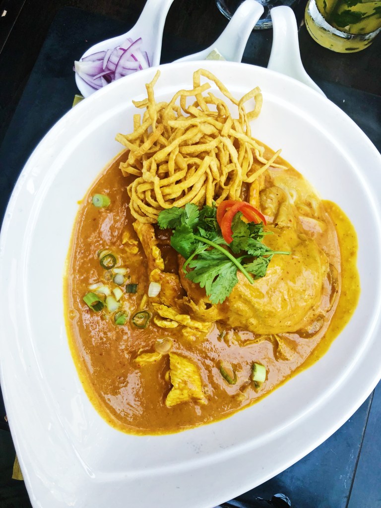 For our main courses, we ordered Red Curry Roast Duck, Coconut Pa-Nang Curry, Coconut Curry Noodle Soup, and Yellow Curry Pineapple Fried Rice. The roast duck was an experience – they brought it to the table in this glass container that was filled with smoke to give the duck a delicious, smokiness that paired perfectly with the traditional red curry it was served with. The pa-nang curry was served in an actual coconut with the coconut water on the side to drink as well – which was unique. The coconut curry soup – or khao soi – is a traditional, famous northern thai dish. It is served with crispy and soft egg noodles in a yellow curry with sides of lime, pickled green mustard, and sliced red onions. Lastly, the pinepple fried rice was served in a hollowed out pineapple. It is filled with jasmine rice infused with yellow curry, cashews, pineapple, raisins, onions and choice of protein.