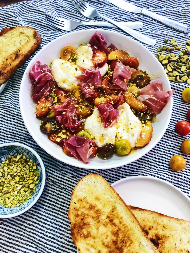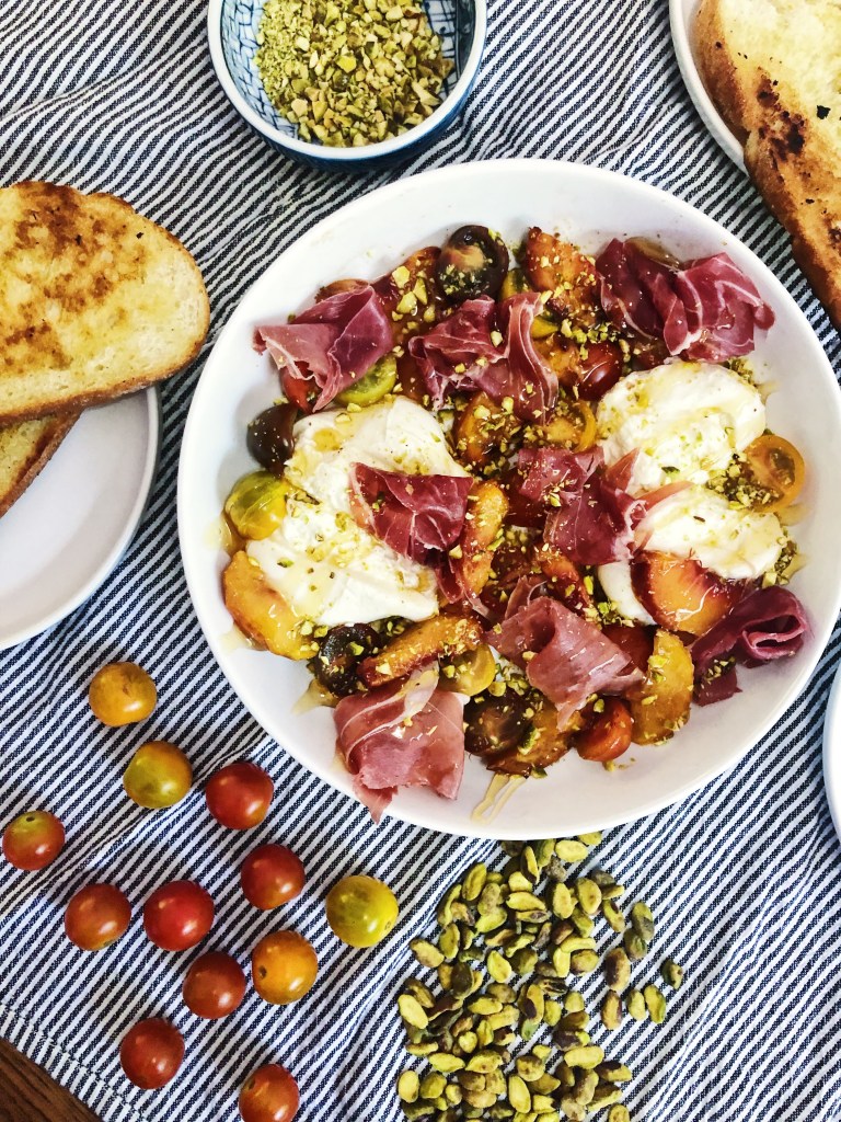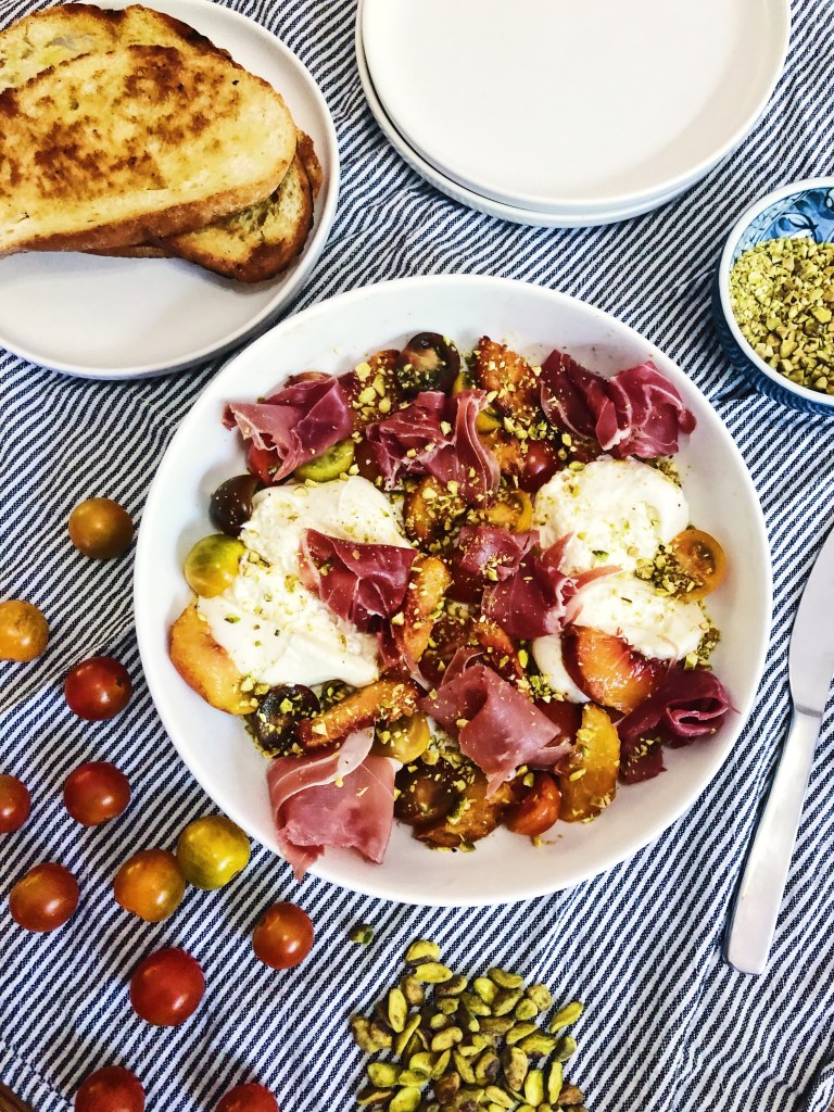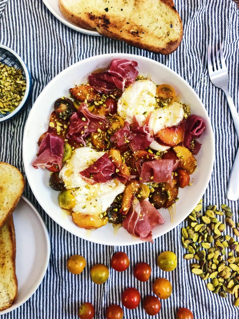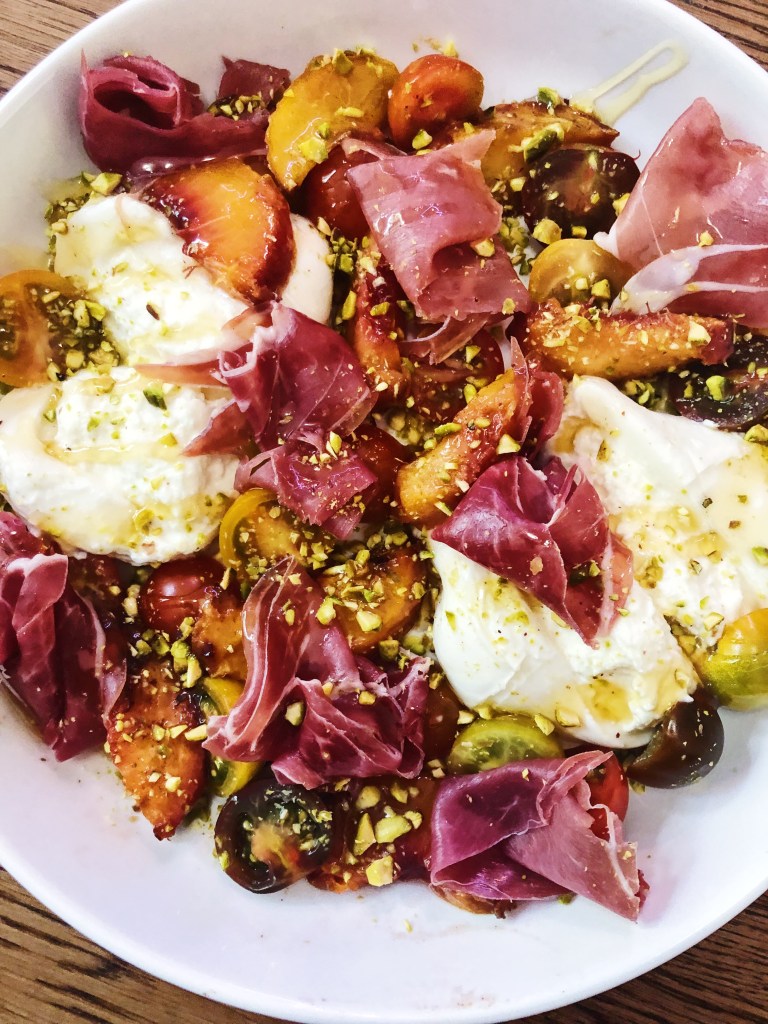 I am not going to claim this recipe as a 100% original thought – I have seen many people putting together similar flavor combinations with peaches being a huge foodie vibe this summer. I will however say that I have never seen anyone put all of these ingredients together in one dish – so that is unique. I have seen a lot of peaches + burrata; or burrata + honey – so while this is not an original creativity, I did take components of many different flavor profiles and textures to combine them in to one stunning dish that I think is more elevated than the ones I have seen. I love this dish because you get the smokiness from the grilled peaches, the creaminess from the burrata, a slight sweetness from the honey, salt from the prosciutto, crunch from the pistachios, and of course the freshness from the tomatoes. So many things working here that you would think it would be a bit much, but in this recipe the ingredients really work together and compliment each other! Give it a try and let me know what you think.