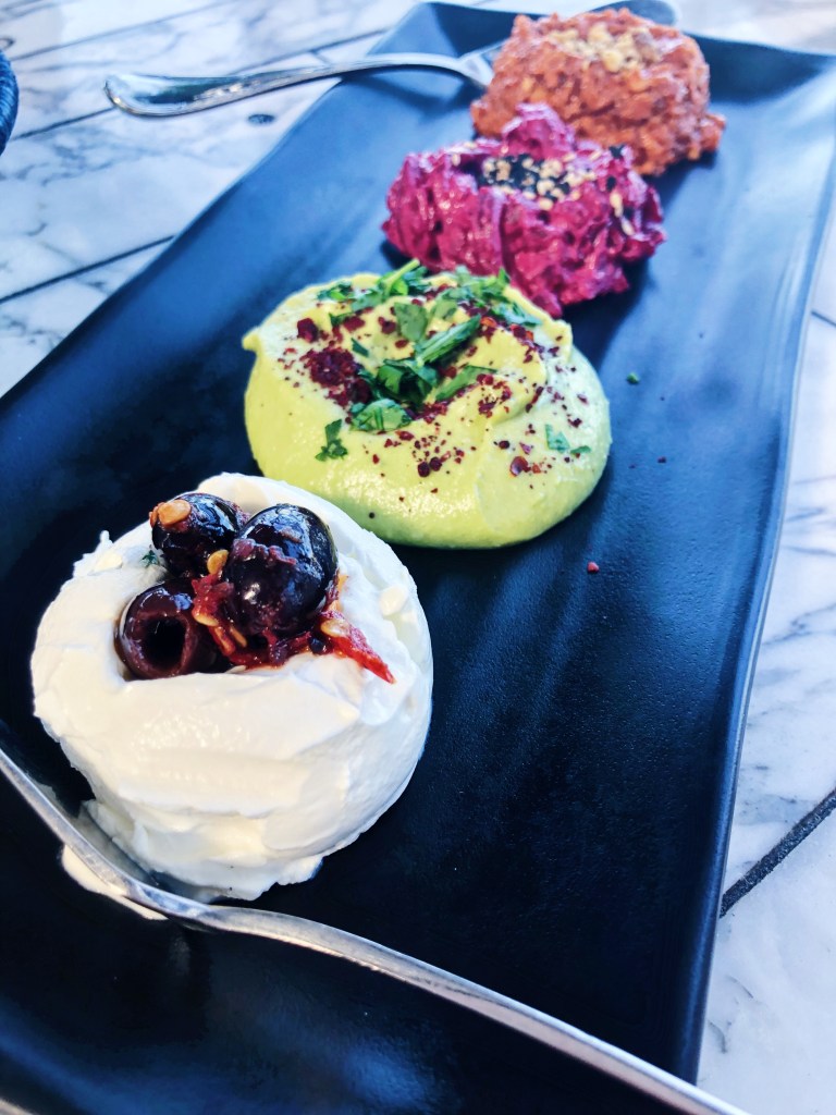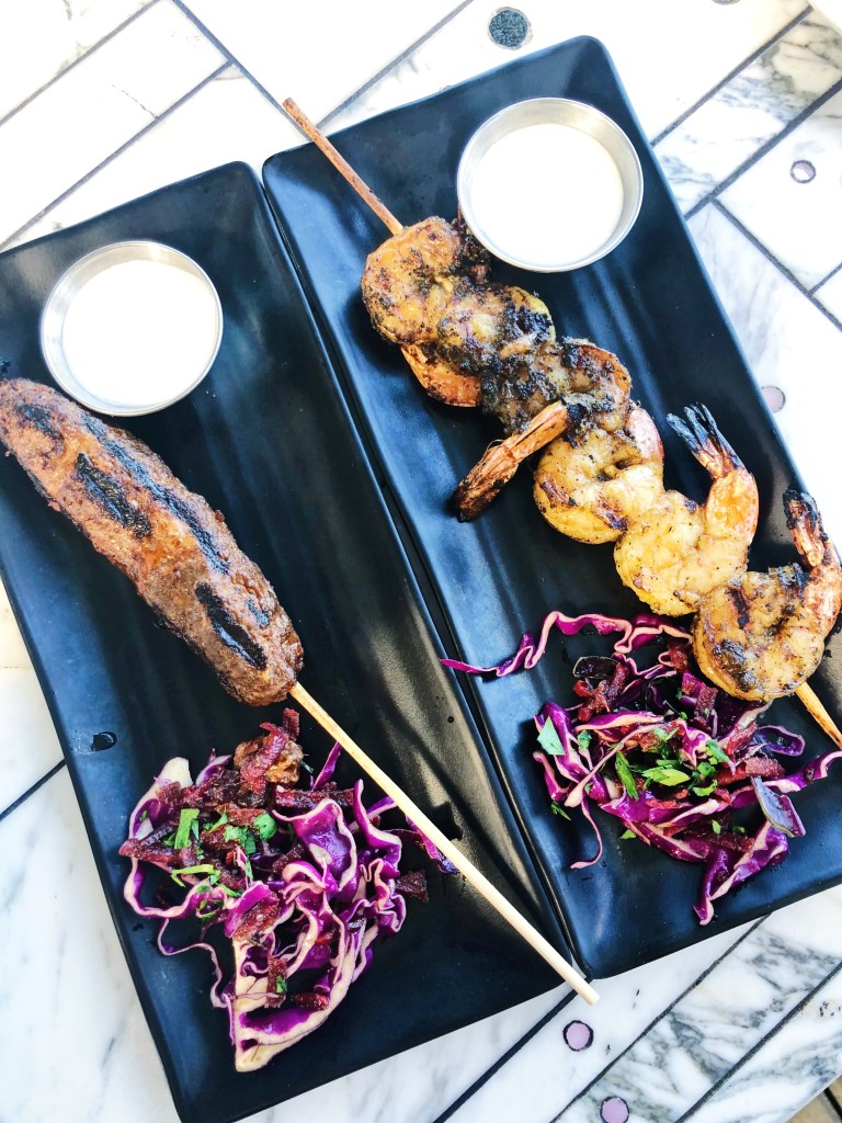 A few dishes I highly recommend (and keep in mind their menu does change with the season, so not everything will be available year-round since they use the freshest ingredients and what is in season!). I always get the mezze platter ($24) that comes with warm pita. This usually has their 4 dips – on my most recent visit there it had shamandar (coffee rubbed beets, tahini, yogurt and sesame); labneh (strained yogurt and eggplant torshi); green chickpea hummus (olive oil, sumac, and parsley); muhammara (red pepper paste, pomegranate molasses, walnut, and breadcrumbs). They were all delicious but if I could only choose one, it would be the muhammara hands done – but I love red bell peppers! I also recommend their kebabs – they have veggie ($13), shrimp ($15), chicken ($16) and lamb kefta ($20) which all come with garlic-tahini yogurt and seasonal slaw. The smoked halloumi cheese ($12) is also delicious and I highly recommend if you have never tried halloumi cheese.