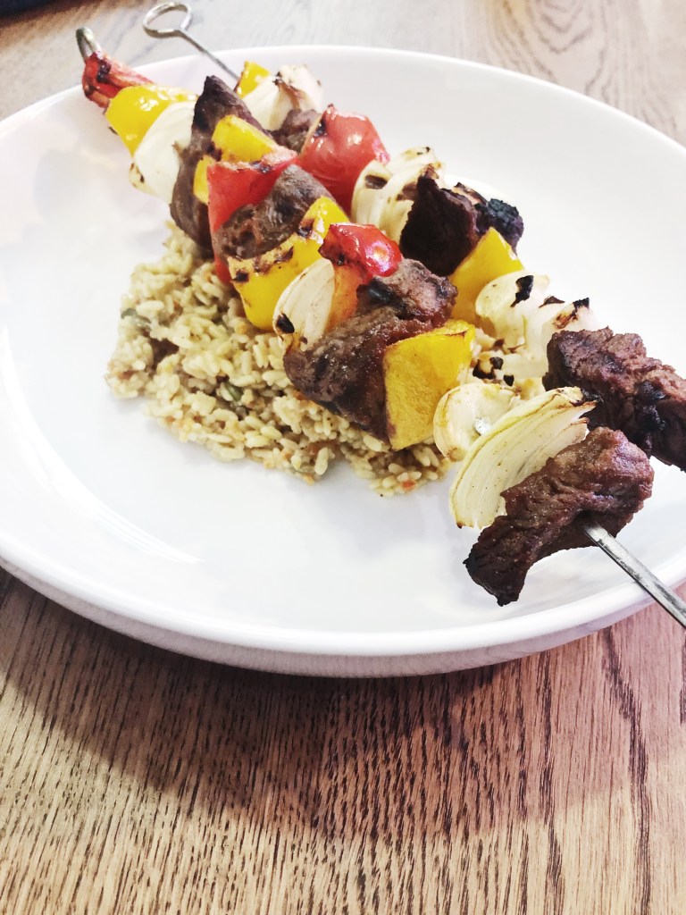 Grilling season is here and I am all for it! Aside from my oven/stovetop, the grill is the most used kitchen appliance in our house – although technically the grill is outside, but you get it! We love grilling – it is so easy, adds a great flavor, and usually mean less dishes to clean! As soon as the rain goes away, the grill comes out. These kebabs are the perfect dish to make if you’re wanting to dust the cobwebs off the grill, or if you need something aside from burgers and hot dogs to make. This recipe originates back to Germany, and probably even further back with other countries. But this is a recipe that has been passed down in my husband’s family over the generations and this is our version of some tweaks we’ve made along the way! The traditional recipe is made with pork (typically pork loin), but we prefer ours with beef! I love exploring new cuisines from other cultures, and this is a super easy and tasty one. The meat stays tender and the marinade yields a sweet, tangy taste that goes perfectly with the slightly charred vegetables. I paired this with a side of rice pilaf – but you could easily serve on their own, with a salad, rice, potatoes, or any of your favorite sides!