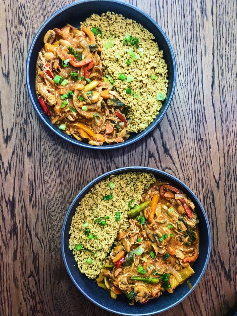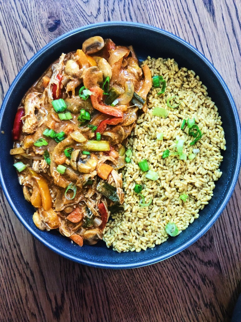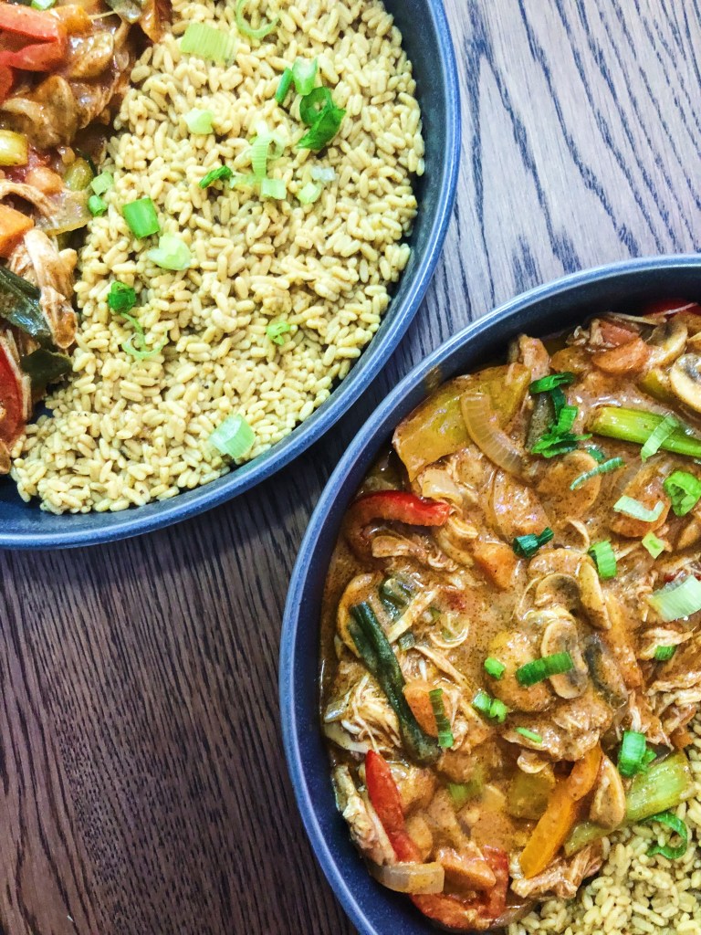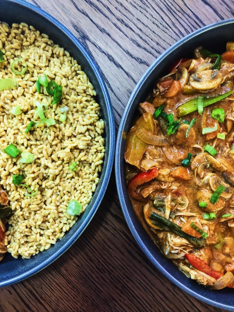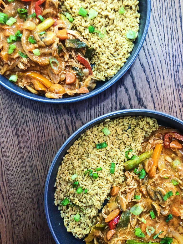 This is a great weeknight dinner when you need something easy and packed full of flavor and vegetables! Curries are my go tos when I don’t know what to cook or when I have vegetables that are about to go bad – I can throw in pretty much whatever ingredients I have and it always turns out delicious! To make this even easier, I use a premade simmer sauce because some days I just don’t have the time or energy to make everything from scratch! This dish is comfort in a bowl, but is still light and healthy packed full of nutrients that don’t leave me feeling meh afterward! I also love this dish because there are so many colors and textures from all the different vegetables we use here. This can also easily be turned in to a vegetarian friendly meal by omitting the chicken – you could opt to replace it with tofu, potatoes, or paneer (or just leave it how it is without the chicken!).