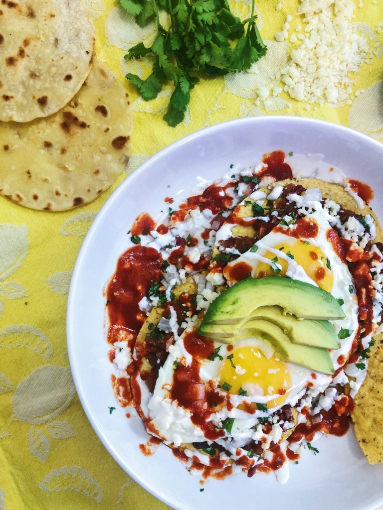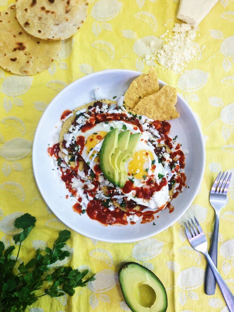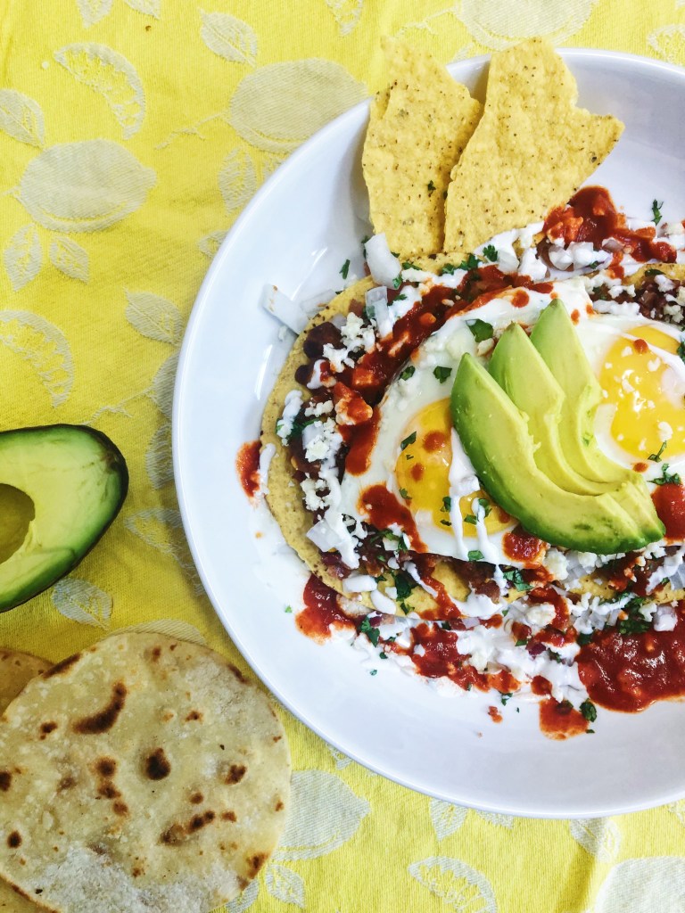 - Now it is time to assemble. Grab a plate and add two tortillas to the bottom. Top with a generous serving of the tomato mixture and top with two eggs. Lastly, top with cotija, diced onion, cilantro, crema, enchilada sauce, and avocado! *repeat this step until all plates have been served* (you do not have to use 2 eggs per plate!).