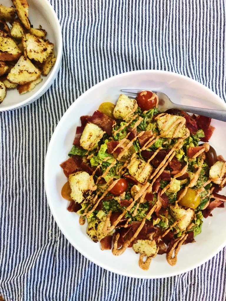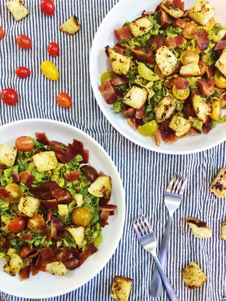 Who doesn’t love a good BLT – it is such a classic and so simple, yet something about the flavors is so good. I am not sure if it is nostalgia that makes a BLT so delicious or the fact that really anything with bacon is bound to taste amazing. Either way, I love a good BLT! I thought it would be fun to make a twist on the BLT and make it in to a yummy salad! It still has all your classic ingredients – bacon, lettuce and tomatoes – as well as garlic sourdough croutons and a smokey, spicy blackened ranch dressing! The blackened ranch really adds another layer of flavors and depth to this dish that works really well together. This is great for a light lunch or when you want to eat more vegetables in your diet – although this is full of bacon, its counteracted by all the lettuce, right? haha..probably not exactly how that works but this salad is delicious and not boring at all.