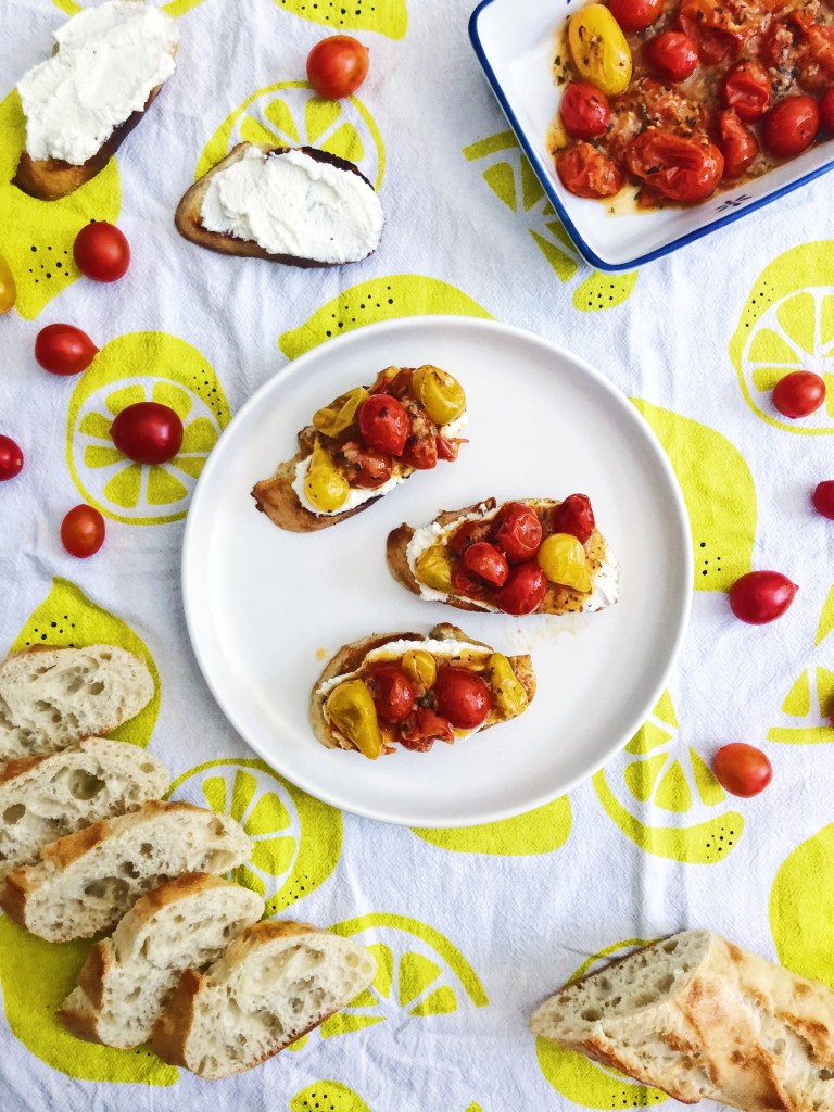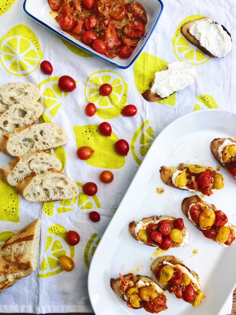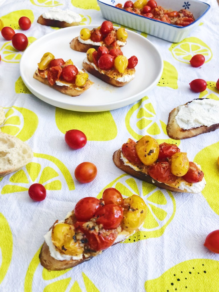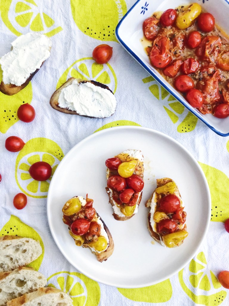 This recipe is goals. It is perfect for any occasion and any season if you ask me. It is light and bright, which is perfect for the summer; but can also be hearty and warm, which is great for the winter! Tomatoes are always delicious, but these blistered tomatoes are really on a whole new level – combined with the basil, garlic, and olive oil they produce a delicious sauce when they start to pop in the oven! This is a super simple and quick recipe to throw together for a party or just a snack. The ricotta adds a delicious creaminess with a soft flavor. Fun fact about me (not this recipe), but I actually hated tomatoes growing up – I think it was a texture thing, but I always refused to eat them and my mom had a very hard time believing that I actually didn’t like them, so she would always make me eat them! As I got older, I learned to appreciate tomatoes more and grew to love them so much!