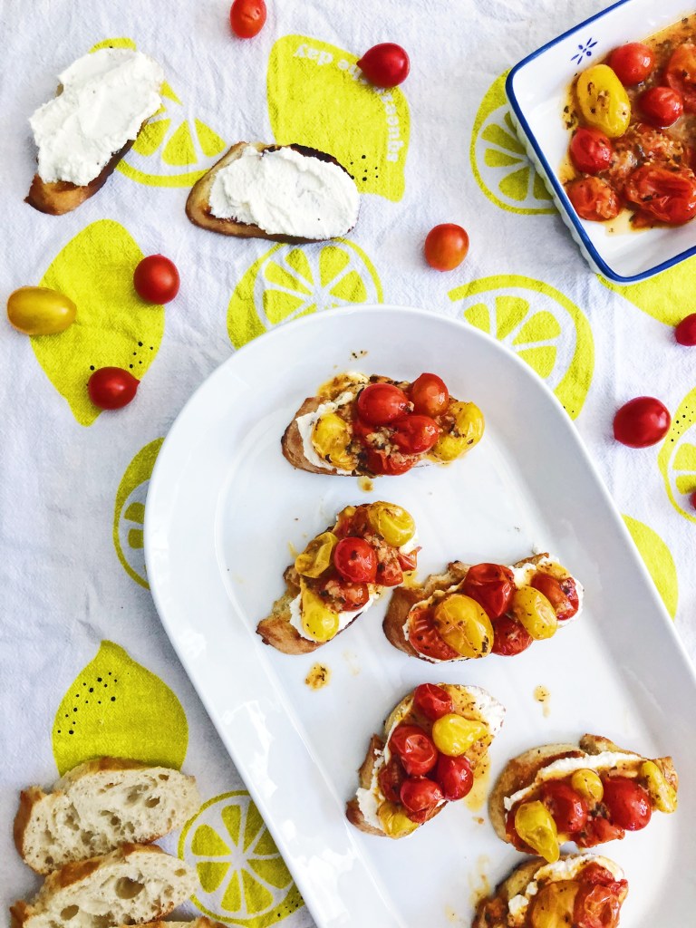 - Once all the components are ready, let’s assemble! Take a baguette slice, add a spoonful of ricotta and spread evenly then top with a spoonful of the blistered tomatoes and sauce! Repeat until all the baguette has been used and serve!