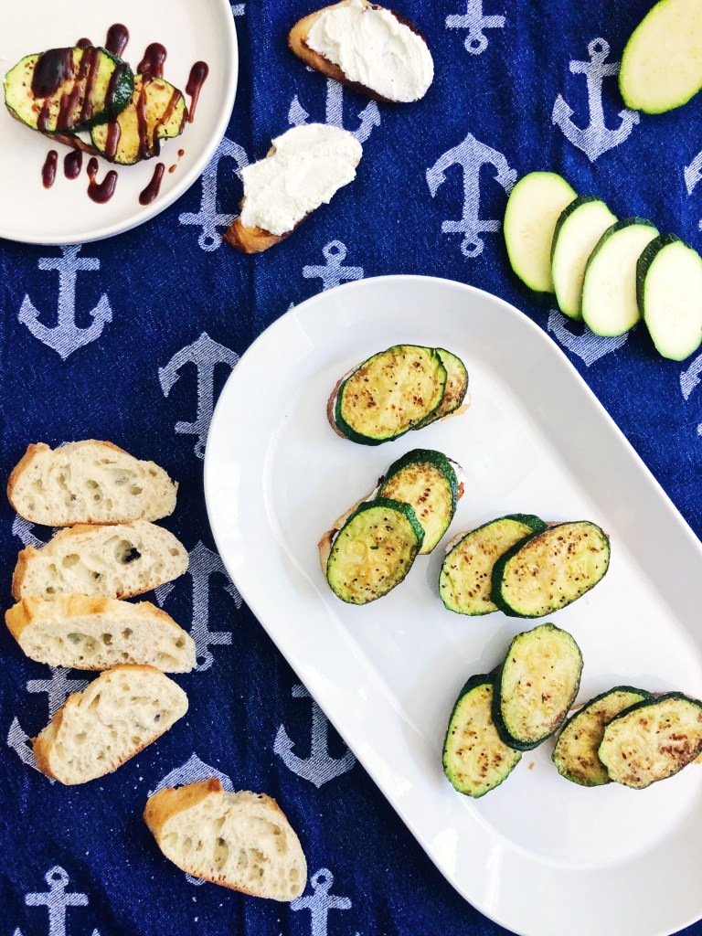- When everything is ready, it is time to assemble! Take a baguette and add a spoonful of ricotta and spread evenly. Top with 2-3 slices of zucchini and drizzle with balsamic* (optional). Repeat until all the baguette has been used and serve!