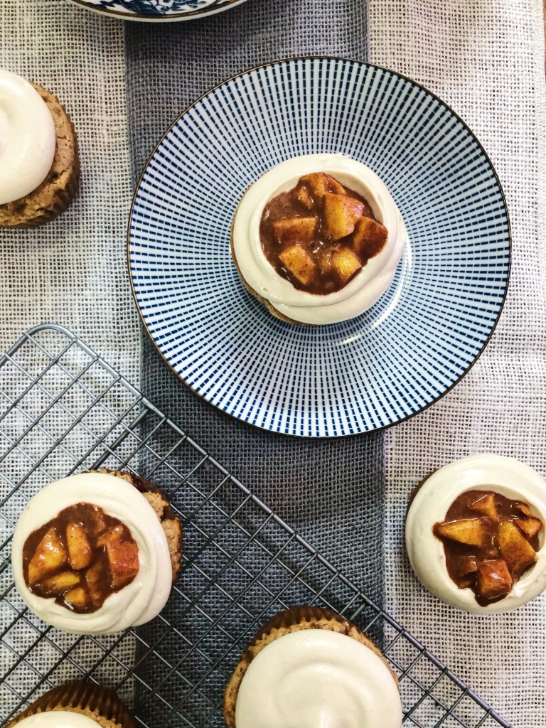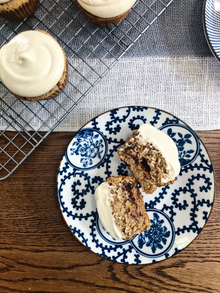 - While the cupcakes cool, let’s make the frosting! Add the cream cheese and butter to the mixer and bet on high until well combined. Add 1 cup of the powdered sugar, and mix on low until well combined. Add in the brown sugar and the remaining powdered sugar – mix on low until combined. FInally, add in the vanilla and milk and continue mixing on medium until fully incorporated.