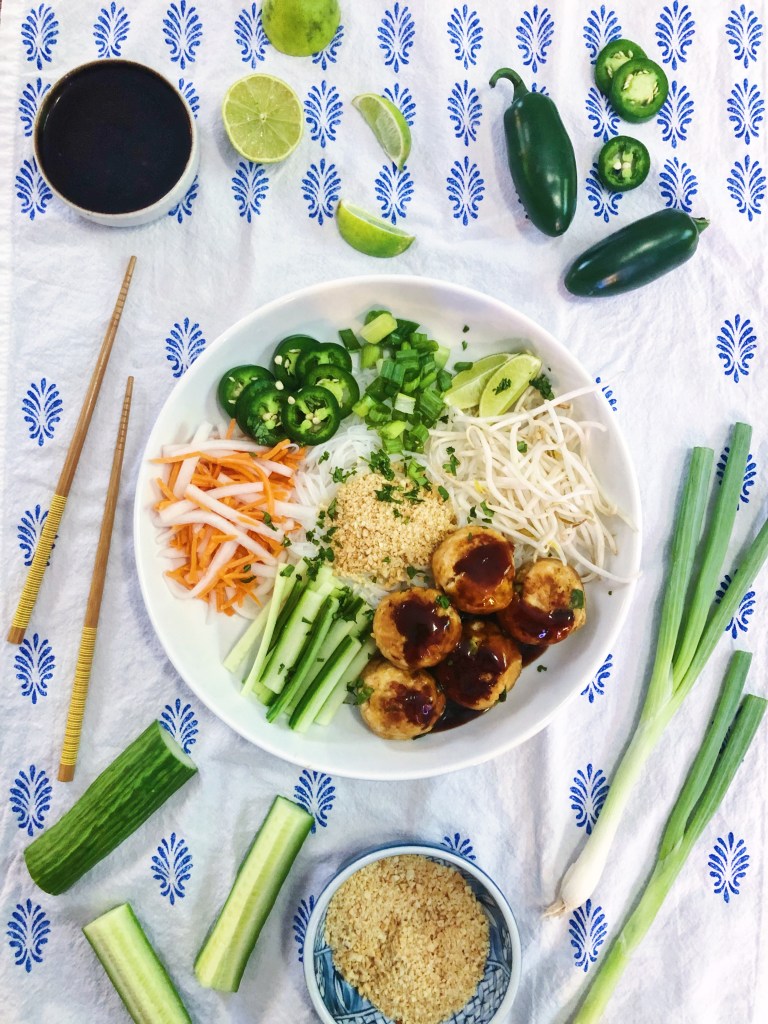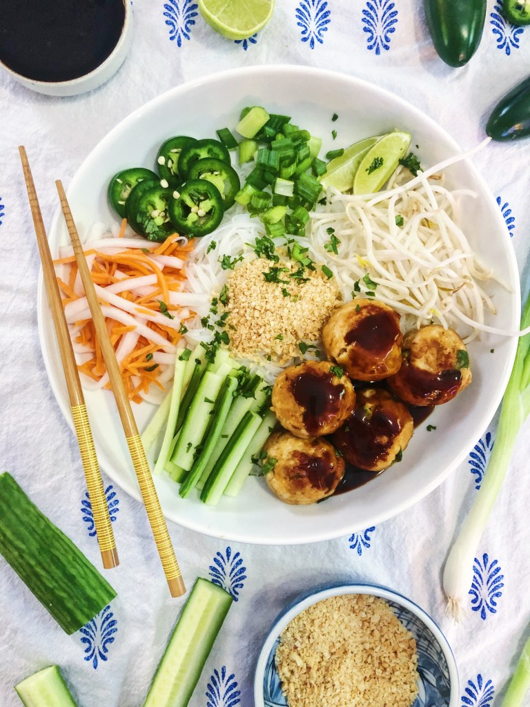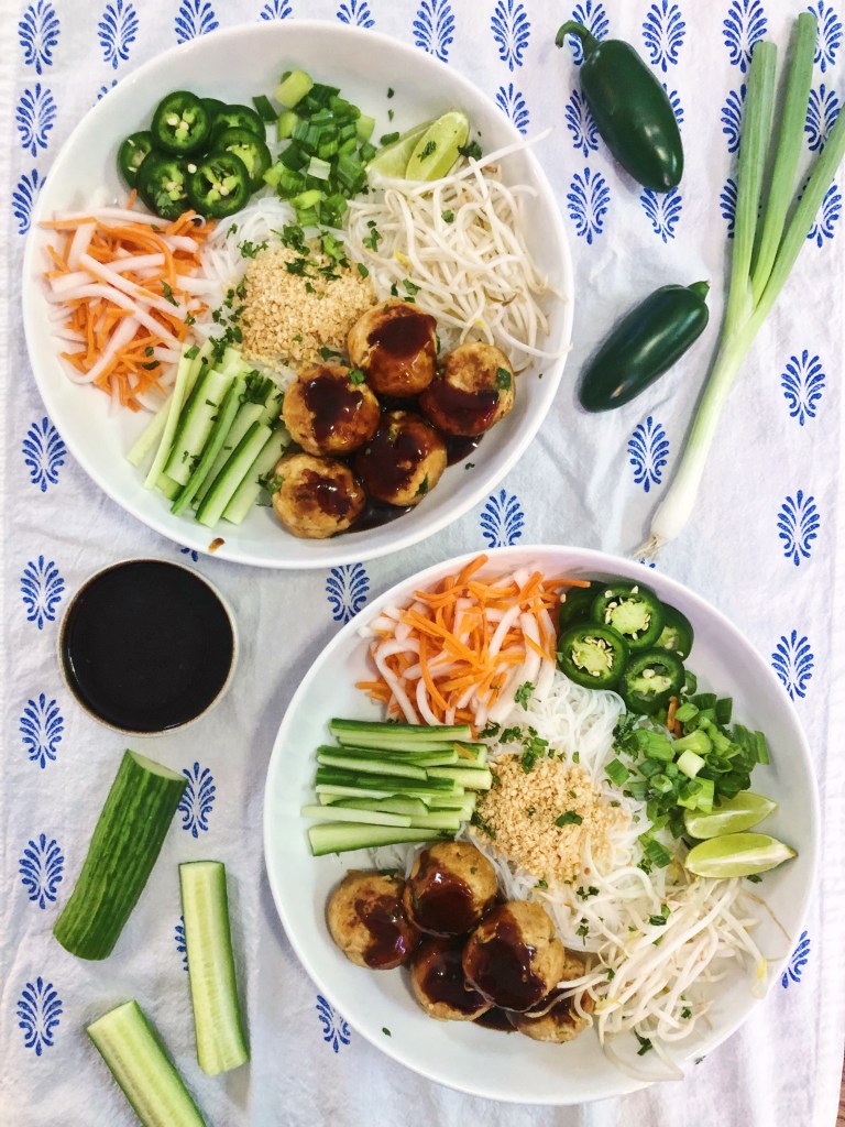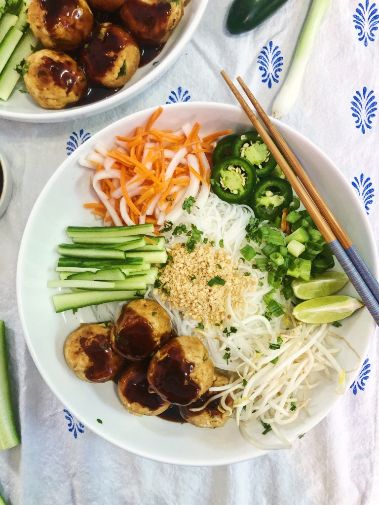 I love a good noodle bowl! Especially when it is packed full of flavors and textures – like these vietnamese inspired bowls. They are light, spicy, acidic and sweet. I love all types of asian food and love trying to create my own versions at home. This dish features fresh vegetables, soft noodles, and meatballs. I am also a sucker for pickled veggies – especially red onion, carrots + daikon, and cucumbers. I cannot rave enough about this dish – it got two thumbs up from everyone and even though I made plenty to eat throughout the week, it was all eaten in one night because no one could get enough! Although the ingredients list may look intimidating with a number of components, the recipe is actually pretty simple if you break it down in to parts. You have to pickle the carrots + daikon first and let them marinate – that is the most time consuming part. Then I recommend getting all the other ingredients prepared before you make the sauce and meatballs so everything is “mise en place” before you get going – this will make things a breeze in the kitchen and you will feel less overwhelmed making this dish. This could also be a fun make your own dish where you prepare all the components and put them out for everyone to assemble their own bowls. One more note is this dish is meant to be cold, so don’t stress yourself out trying to make sure everything is warm before serving!