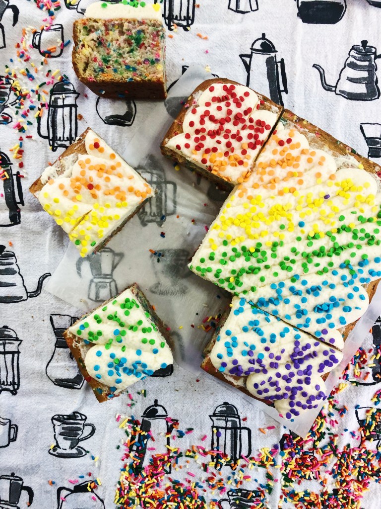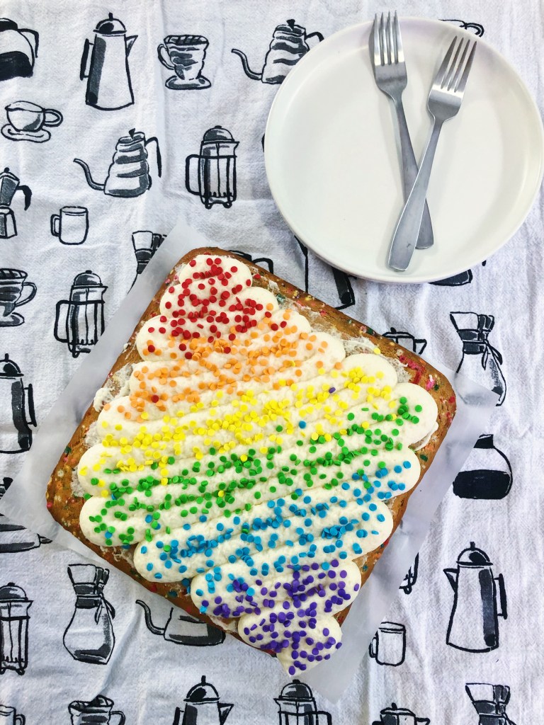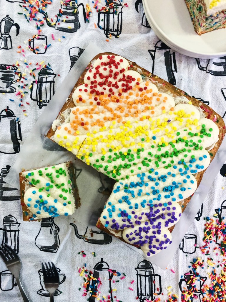 - When the cake has completely cooled, spread the icing evenly across the cake and top with more sprinkles if desired. Slice and serve!