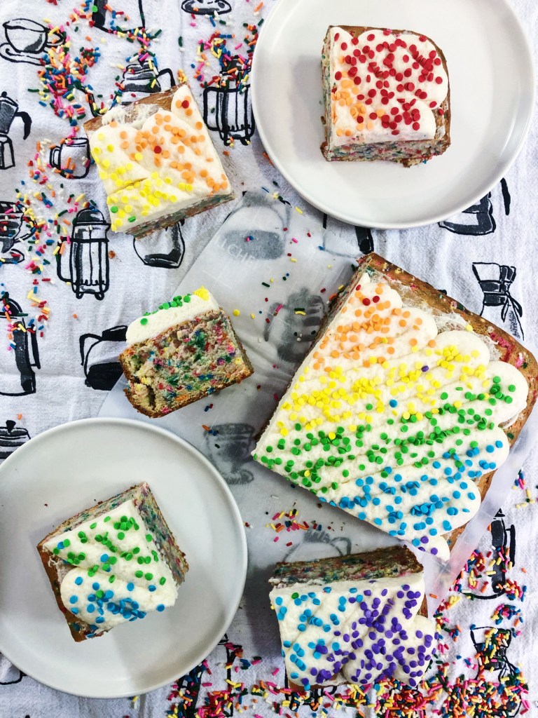 Funfetti has always been my favorite type of cake – probably because of the sprinkles. I LOVE sprinkles – especially rainbow sprinkles. I have always added them to ice cream and desserts because they are so fun and colorful. Anyways, growing up I baked a lot – but I was not as of a skilled baker as I am now, although I still have a long way to go. I used to rely on boxed cake mixes as my base – I would add things to them and try to get creative, but I was far from being able to bake a cake from scratch, on my own. Funfetti was always my go to when I would bake for friends in my early days of learning how. Fast forward 20 years and I still have a love for funfetti, but you won’t find any box mixes here. This is all the fun of funfetti, but none of that fake flavor the box mix has – you all know what I am talking about, don’t deny it. As I stated above, I am a big fan of sprinkles, so the more the better. This cake is loaded with sprinkles throughout and I topped it with even more sprinkles for a fun, colorful slice! If you are looking to bake for a friend or just want to be nostalgic bake this cake for a deliciou cake.